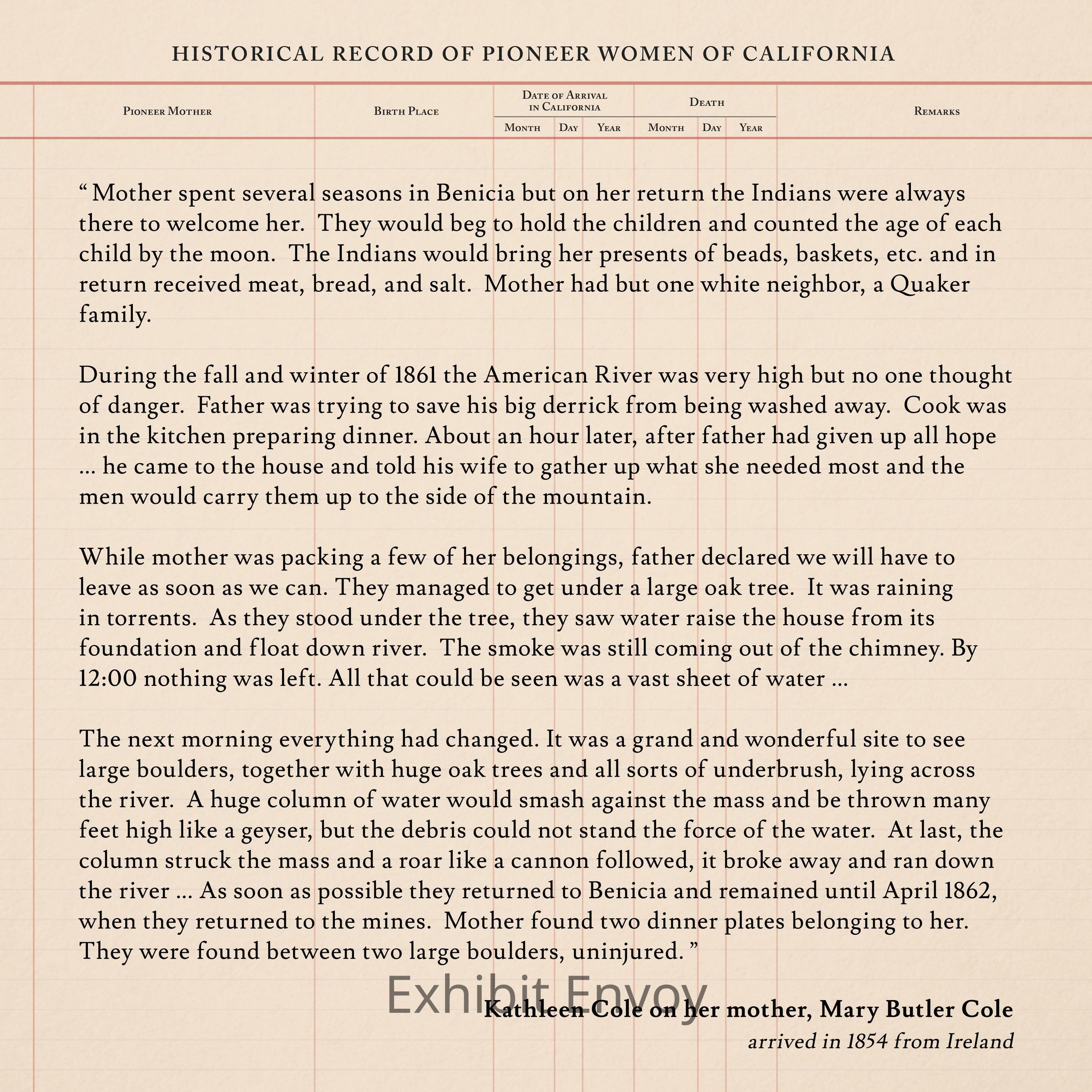 The next morning everything had changed. It was a grand and wonderful site to see large boulders, together with huge oak trees and all sorts of underbrush, lying across the river. A huge column of water would smash against the mass and be thrown many feet high like a geyser, but the debris could not stand the force of the water. At last, the column struck the mass and a roar like a cannon followed, it broke away and ran down the river ... As soon as possible they returned to Benicia and remained until April 1862, when they returned to the mines. Mother found two dinner plates belonging to her. They were found between two large boulders, uninjured. ”