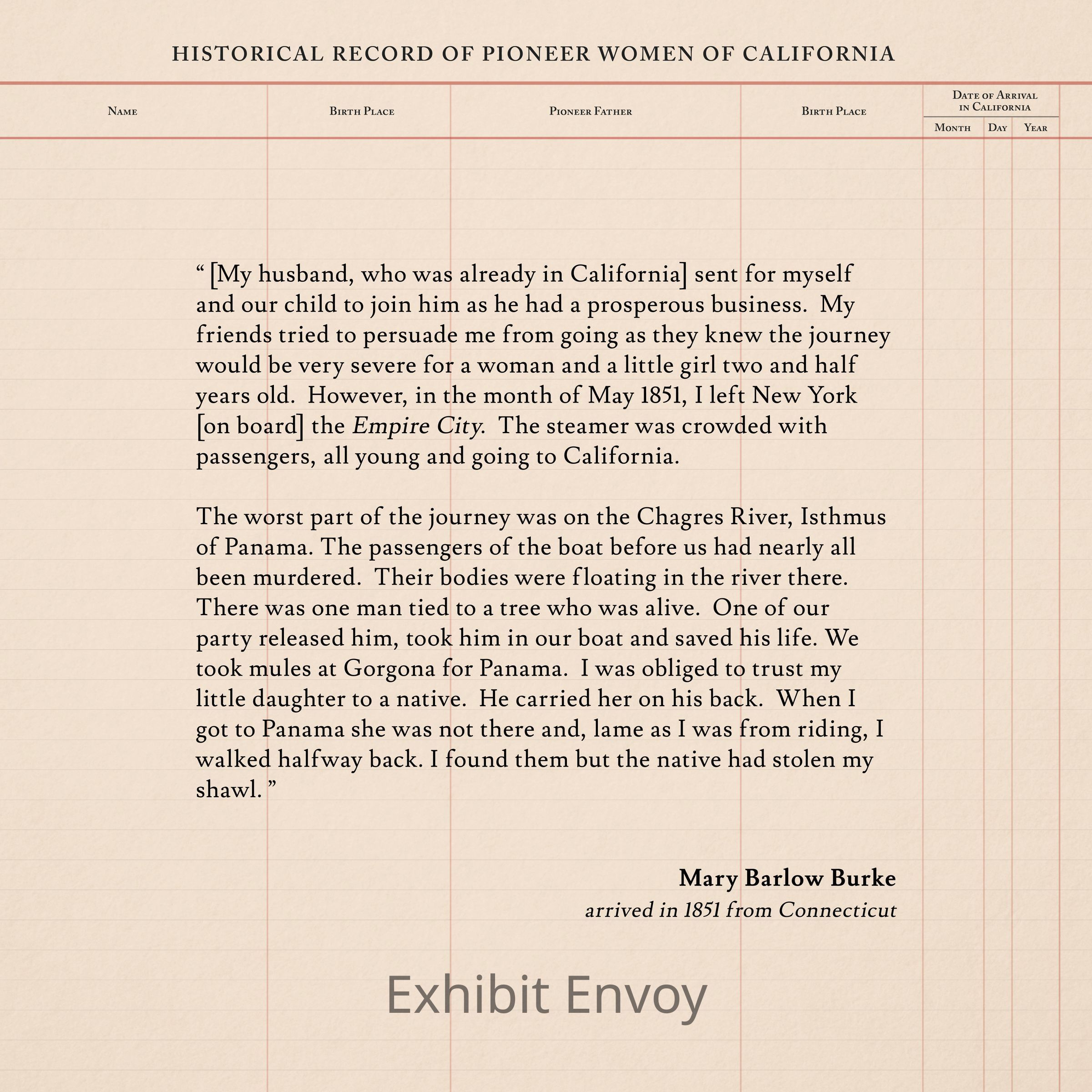 “ [My husband, who was already in California] sent for myself and our child to join him as he had a prosperous business. My friends tried to persuade me from going as they knew the journey would be very severe for a woman and a little girl two and half years old. However, in the month of May 1851, I left New York [on board] the Empire City. The steamer was crowded with passengers, all young and going to California.