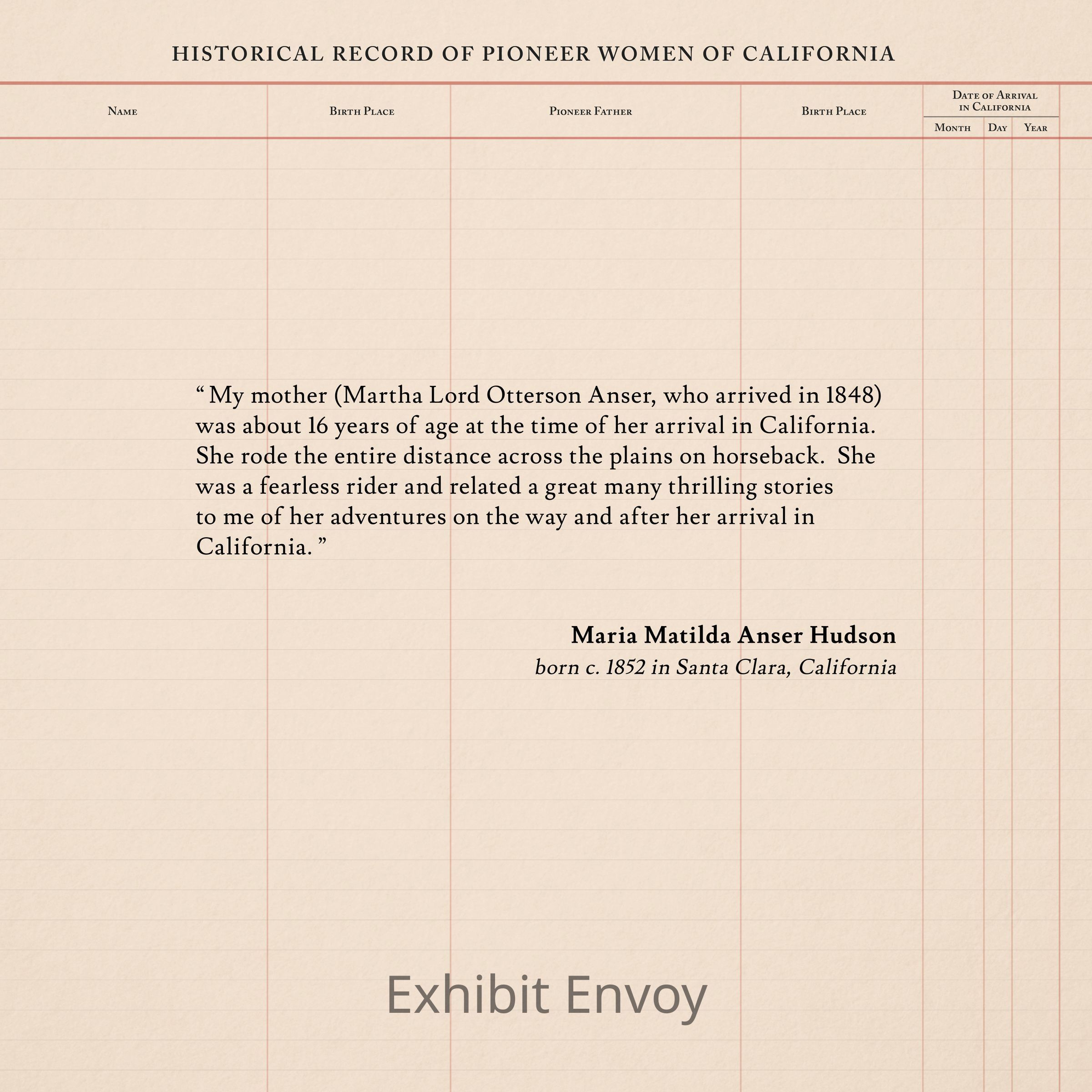“ My mother (Martha Lord Otterson Anser, who arrived in 1848) was about 16 years of age at the time of her arrival in California. She rode the entire distance across the plains on horseback. She was a fearless rider and related a great many thrilling stories to me of her adventures on the way and after her arrival in California. ”