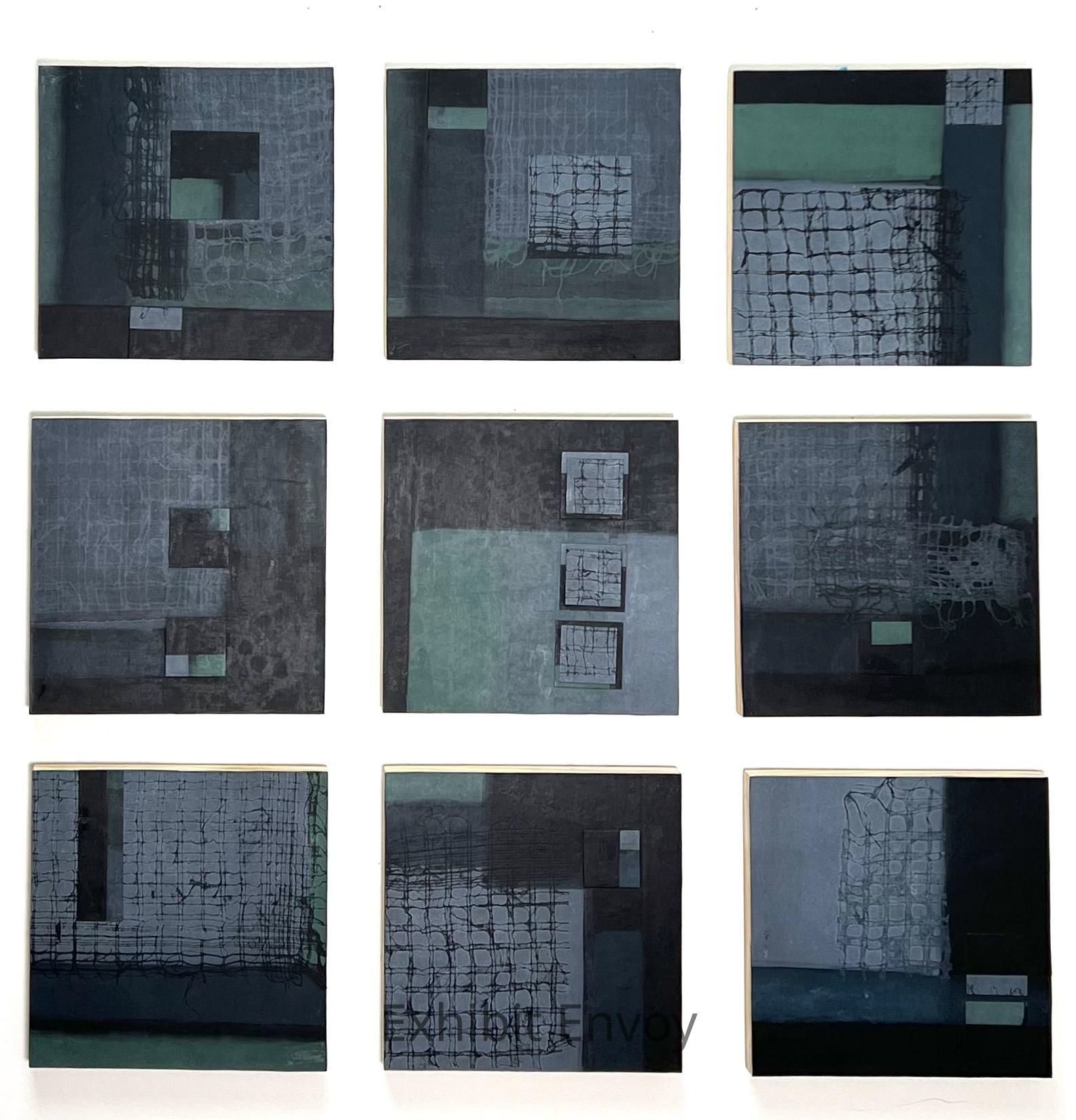 The Nine Patch is a traditional quilt design, offering the maker infinite flexibility within a clear structure. This piece is composed from a series of monoprints, using threads as both stencils and plates. The prints were cut and pieced into a nine patch arrangement. The installation further references the traditional quilt structure as the nine patches are separated by a two inch border, or “sashing” which in this case is supplied by the gallery wall.