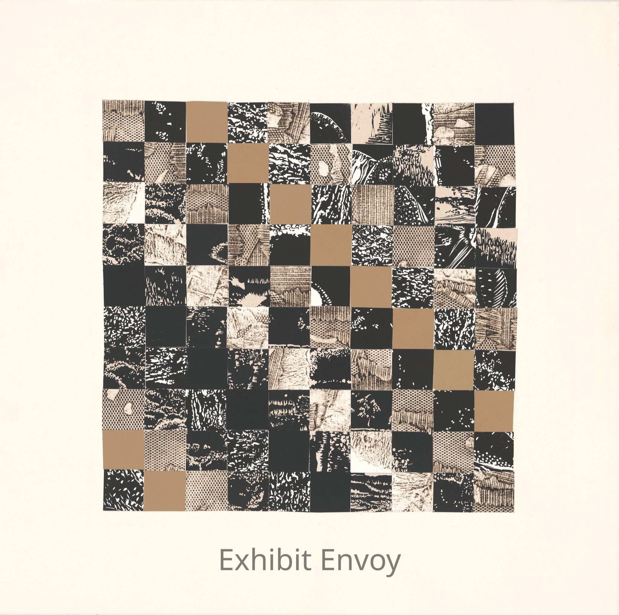 Black and white linocuts, a linocut with a subsequent beige drop, and a collagraph were cut up and glued to Rives BFK paper.
