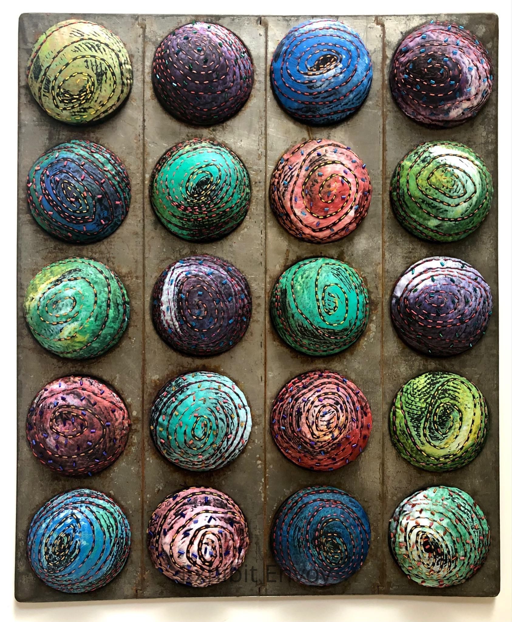 C-Lon thread, Fiberfil, cotton batting, seed beads, vintage tin baking pan.