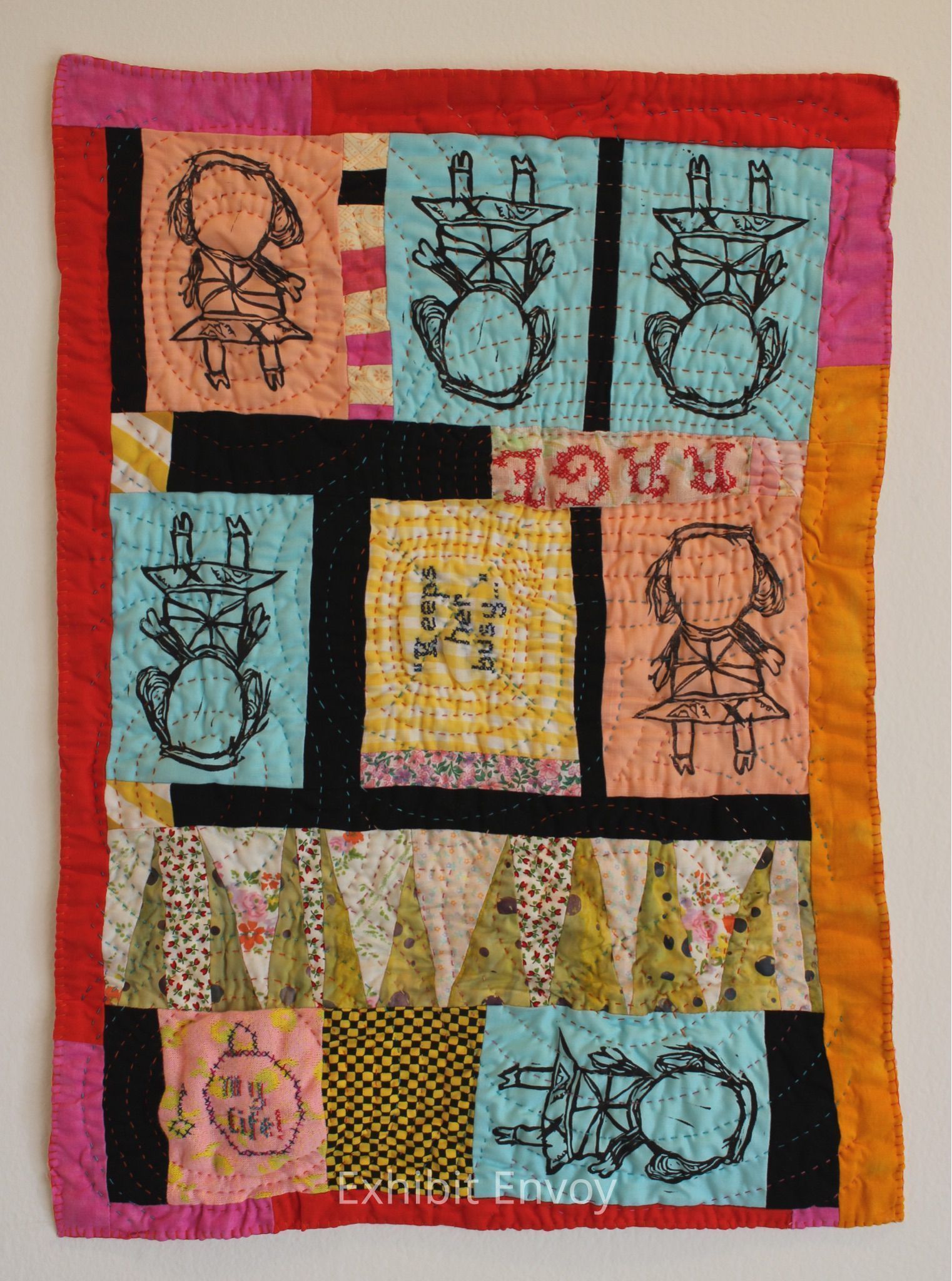 Relief printmaking with linoleum, machine piecing, hand quilting, cross stitch embroidery, blanket stitch.