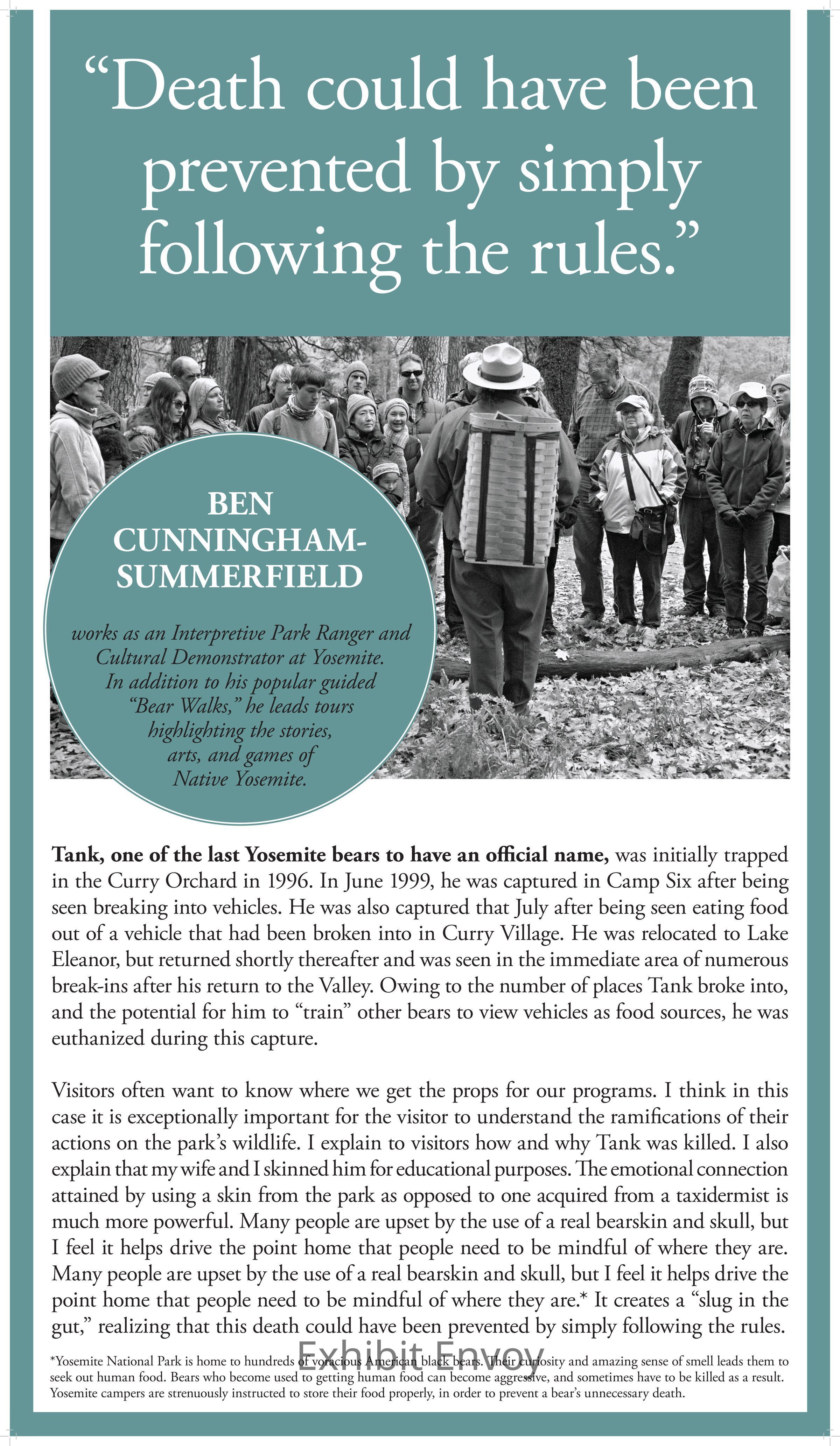 Ben Cunningham-Summerfield works as an Interpretive Park Ranger and Cultural Demonstrator at Yosemite. In addition to his popular guided “Bear Walks,” he leads tours highlighting the stories, arts, and games of Native Yosemite.