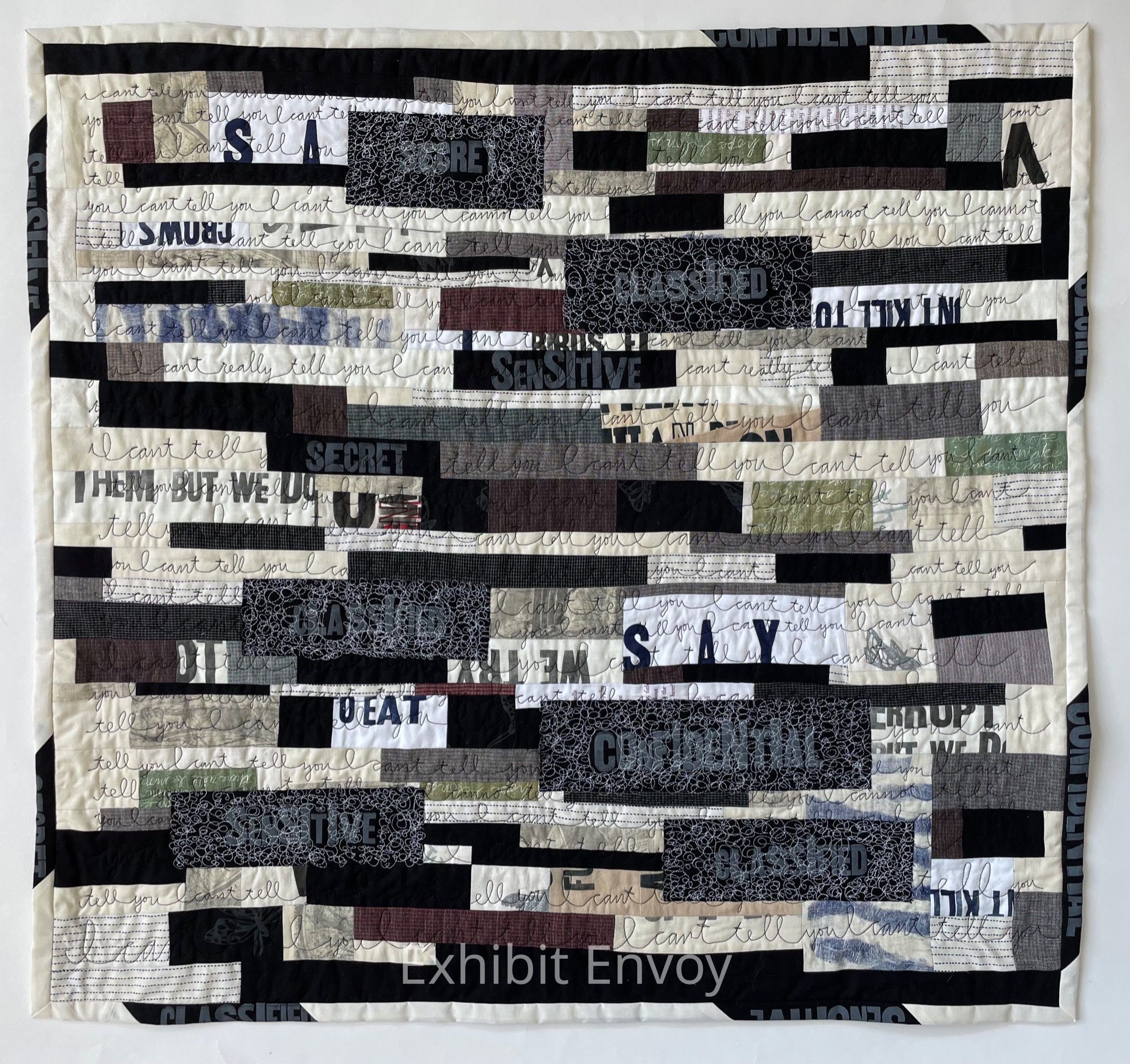 The week the redacted affidavit was released regarding the search of the former president's residence, I set wood type and letterpress printed the words: secret, sensitive, classified, and confidential. Over other pieced and printed scraps I free-motion quilted "I can't tell you." Two of the newly printed strips were pieced into the whole, the rest I appliquéd, leaving the raw edges, and free-motion quilted scribbles over all but the letters that spell out REDACTED. An erasure, of sorts.Label Type