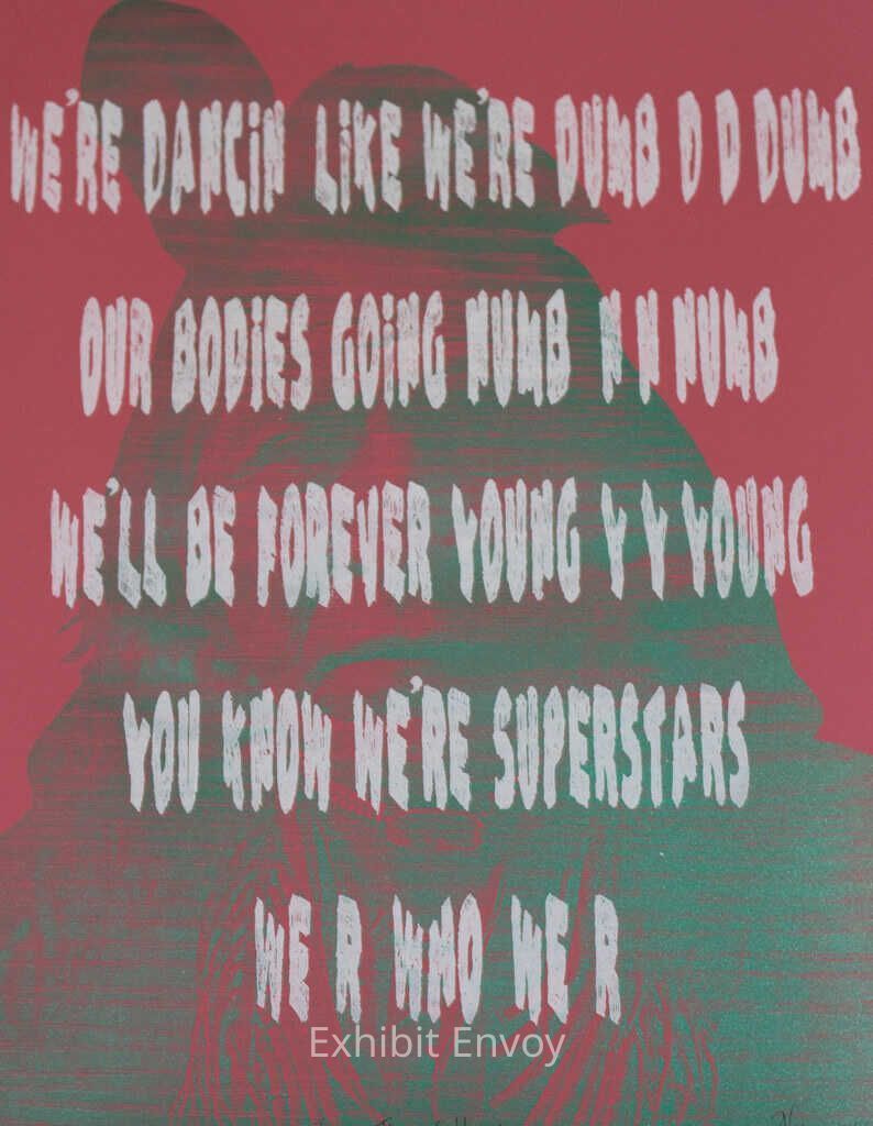 Native Alaskan artist Nicholas Galanin subverts expectations within this print. Many viewers would expect words of wisdom or profound knowledge to be paired with an image of a Native American man in traditional dress. Instead, the words are taken from lyrics by pop artist Kesha, and chosen specifically for their lack of depth.