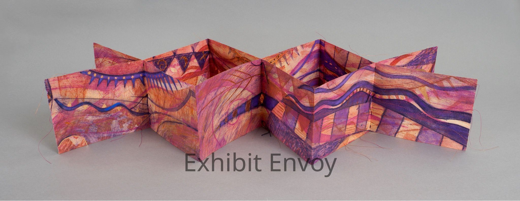 This is an accordion fold book structure. The double accordion structure is stitched where the valleys of the accordion fold meet. The panels are printed collagraphs on Reeves BFK and inked in intaglio and relief methods with water-immiscible inks. Warm hues are juxtaposed with cool tones to create contrast. Copper leaf has been added to enhance shapes or create new shapes. The print has multiple sewn lines to echo the linear pathways throughout the image. Copper thread, regular sewing thread,