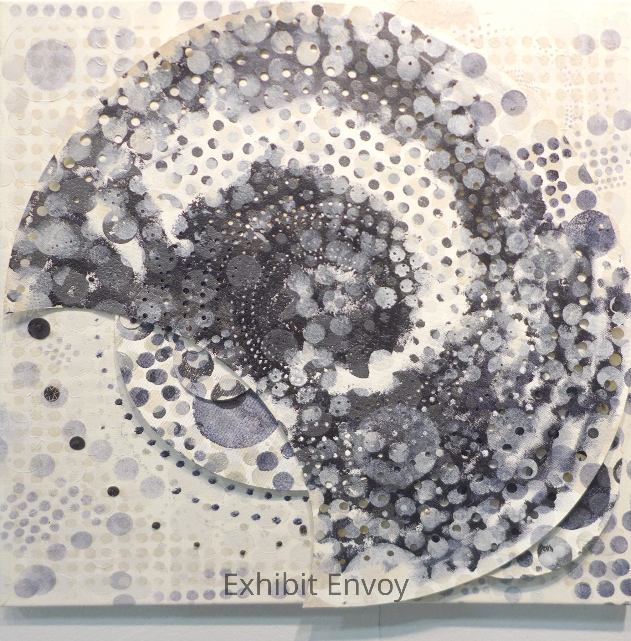 This Spiral Galaxy is the culmination of my journey exploring stenciling and using the laser cutter as a tool. Canvas was cut and used as a stencil to hand print both stretched canvas and sheets of canvas. Then those printed sheets could also be laser cut. Both the stencil and the circle shapes were then attached to the printed stretched canvas. French knotted circles are layered into the galaxy of circling elements. Ever spinning.Label Type