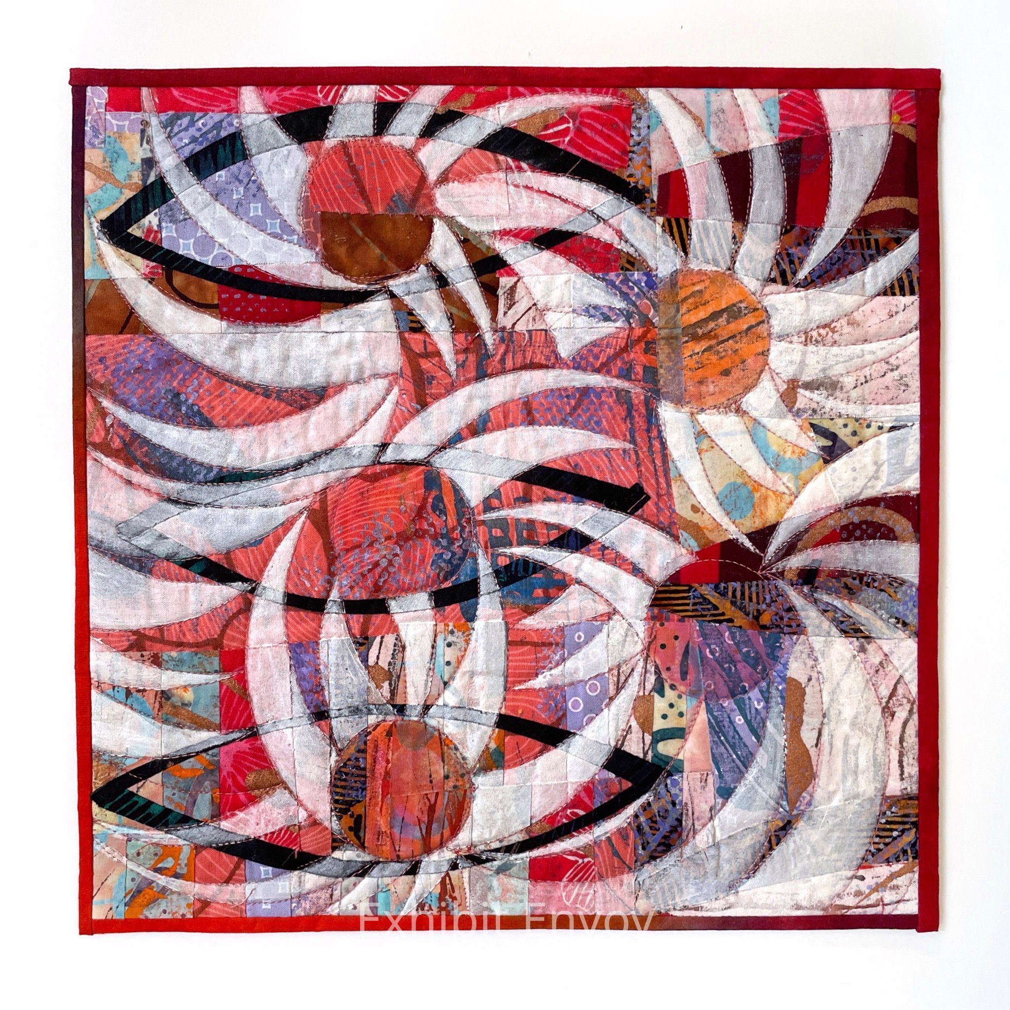 I started with leftover scraps of monoprinted fabric and pieced them together improvisationally. I machine quilted circles with radiating curves that reminded me of suns. I hand painted the shapes with white to bring the suns into the foreground.Label Type