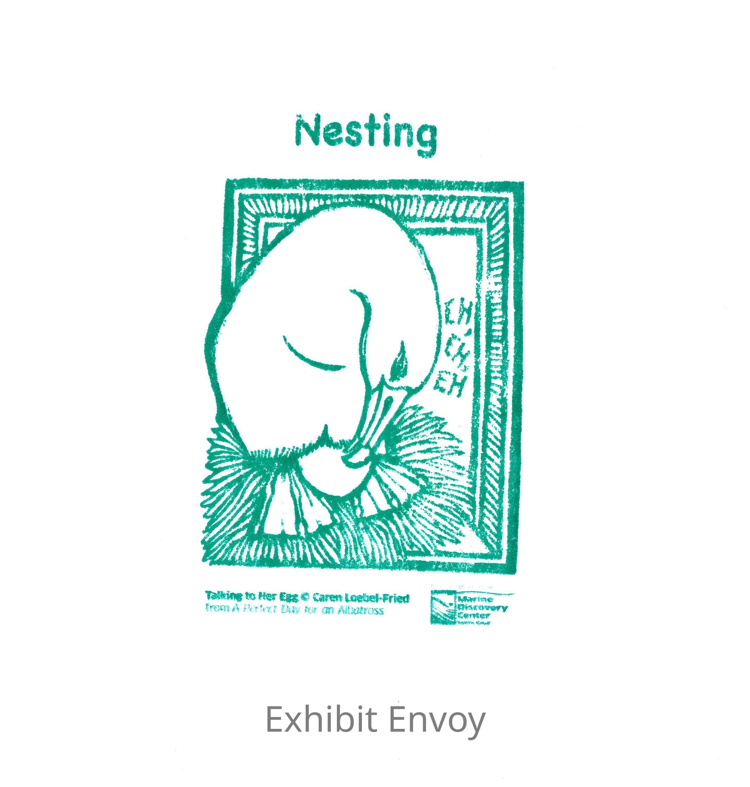 Self-inking Trodat Stamp 5212 with "Talking to Her Egg" artwork. Green ink with "Nesting" title at top. Uses 6/512 Trodat replacement stamp pad.Dimensions