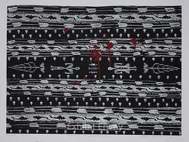 Using no text, Hernandez subtly depicts the effects of the U.S.-supported Guatemalan military massacre of Mayan campesinos during their long civil war. What appears to be a traditional Guatemalan weaving depicts male and female calaveras (the female with a baby skull inside her), helicopters, skulls, and the blood spatters of bullet holes. The narrative mutely bears witness to the victims.