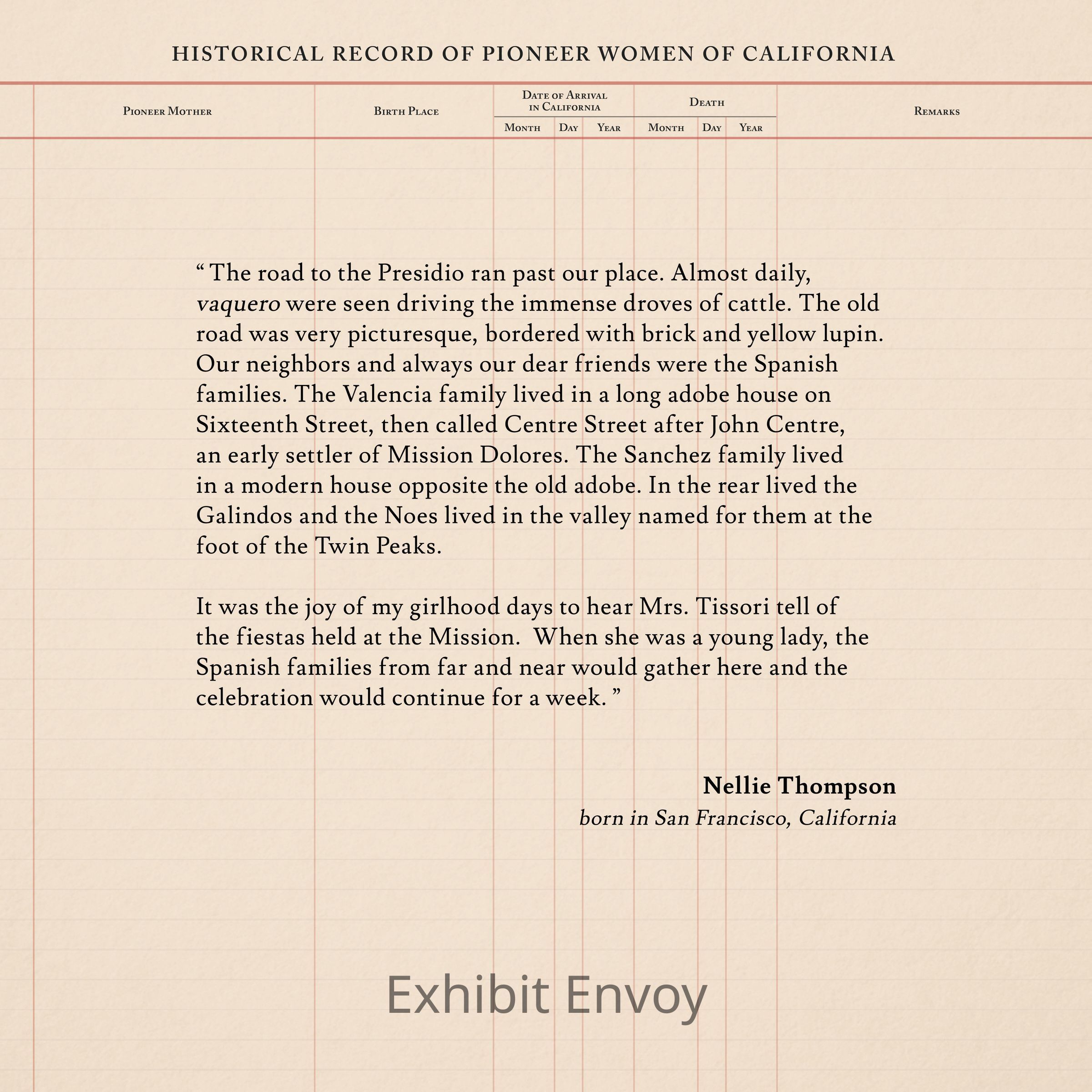 “ The road to the Presidio ran past our place. Almost daily, vaquero were seen driving the immense droves of cattle. The old road was very picturesque, bordered with brick and yellow lupin. Our neighbors and always our dear friends were the Spanish families. The Valencia family lived in a long adobe house on Sixteenth Street, then called Centre Street after John Centre, an early settler of Mission Dolores. The Sanchez family lived in a modern house opposite the old adobe. In the rear lived the Galindos and the Noes lived in the valley named for them at the foot of the Twin Peaks.