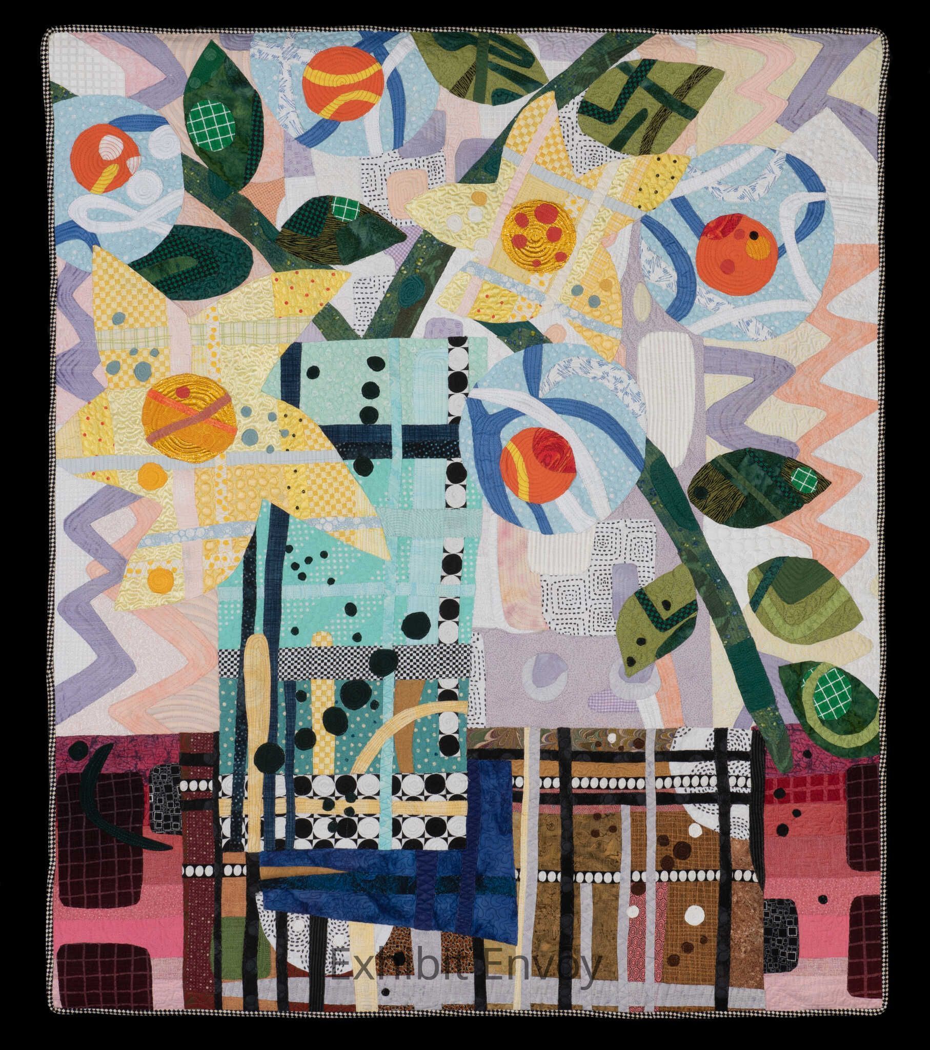 Valerian is inspired by a playful still life of flowers and leaves gathered from a California field. The first step was to create the still life by cutting the shapes out of my painted canvases and collaging them by stitching the canvas pieces together. Then I translated that stitched painting into this quilt. This piece is the second in my new series based on California wildflowers.
