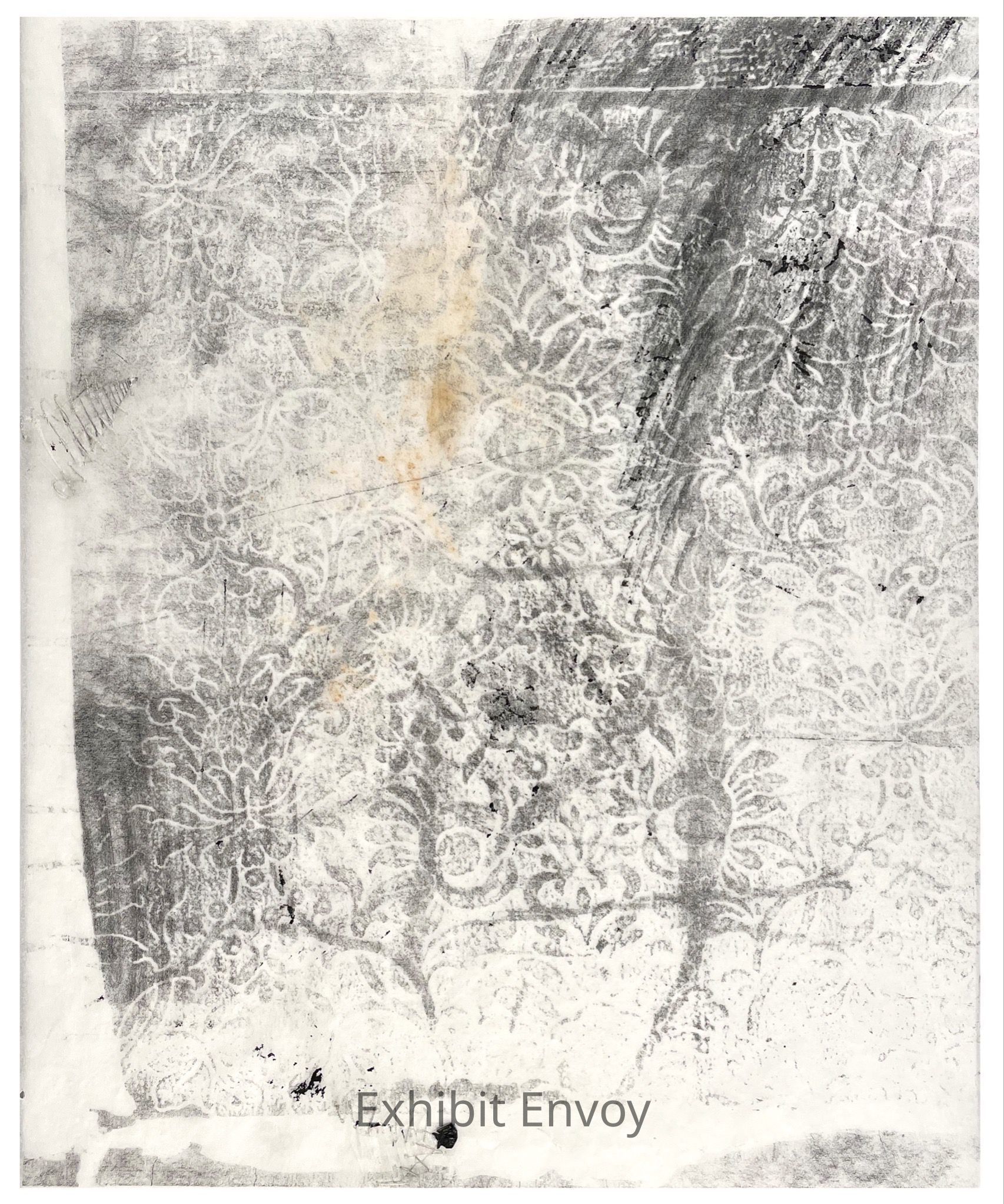 The “Veiled” image series intertwines textile patterns with a layering of printmaking techniques. In much the same way that dust would be brushed aside or a stain would be removed from a surface through vigorous rubbing, these brocade patterns emerge upon the paper. What is obscured, what is illuminated? What becomes seen though pressure and tone? This combination produces an image that hints to a textile made of shifting tone, like a shadow.Label Type