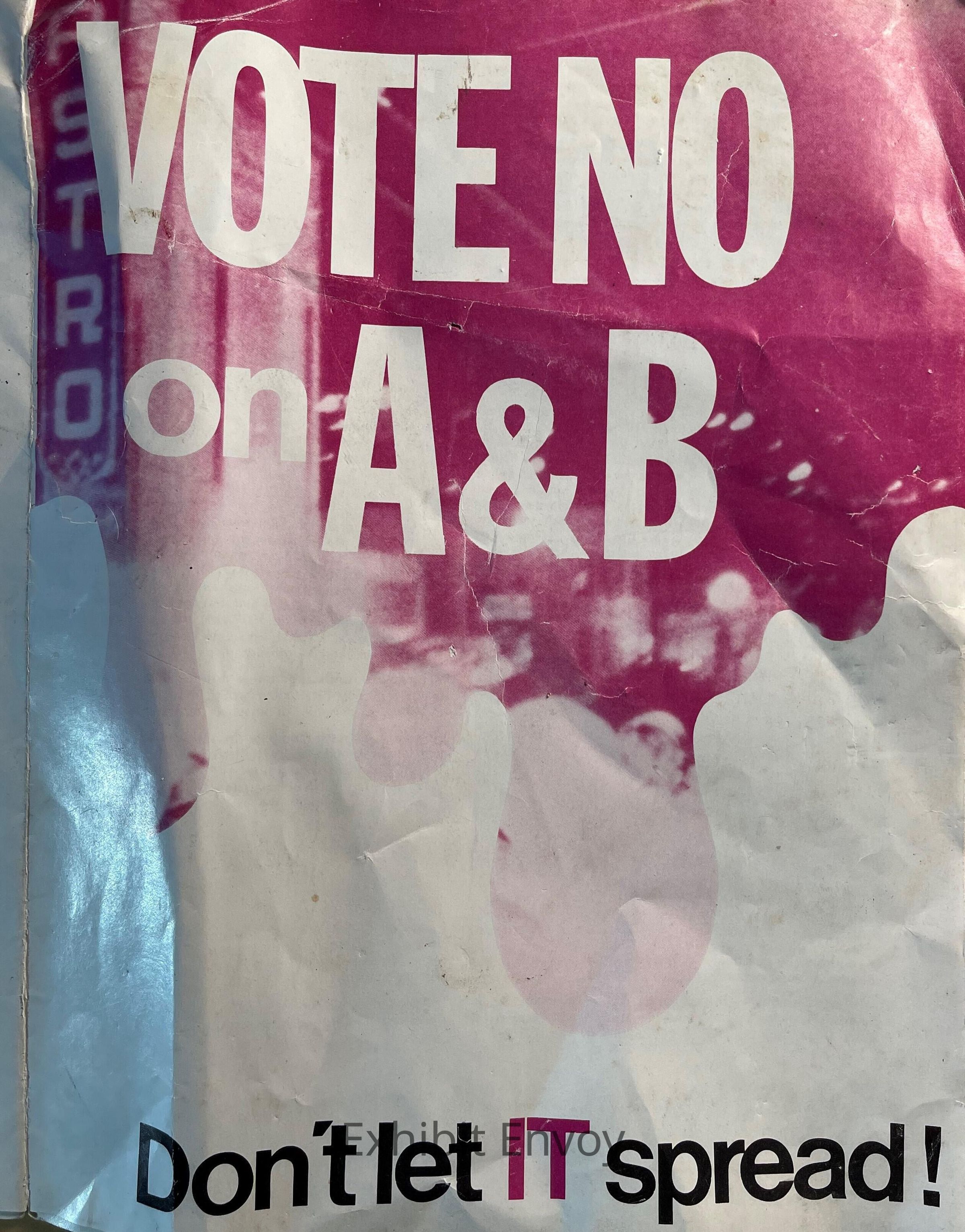 In 1980, the statutes were brought before the public as Measures A&B. A “Yes” vote on A&B would keep protections for gay people in place; a “No” vote would repeal them. As evidenced by this pamphlet, the “No” campaigners launched a brutal, homophobic operation, using slogans like “Don’t Let It Spread” – “it” being homosexuality.
