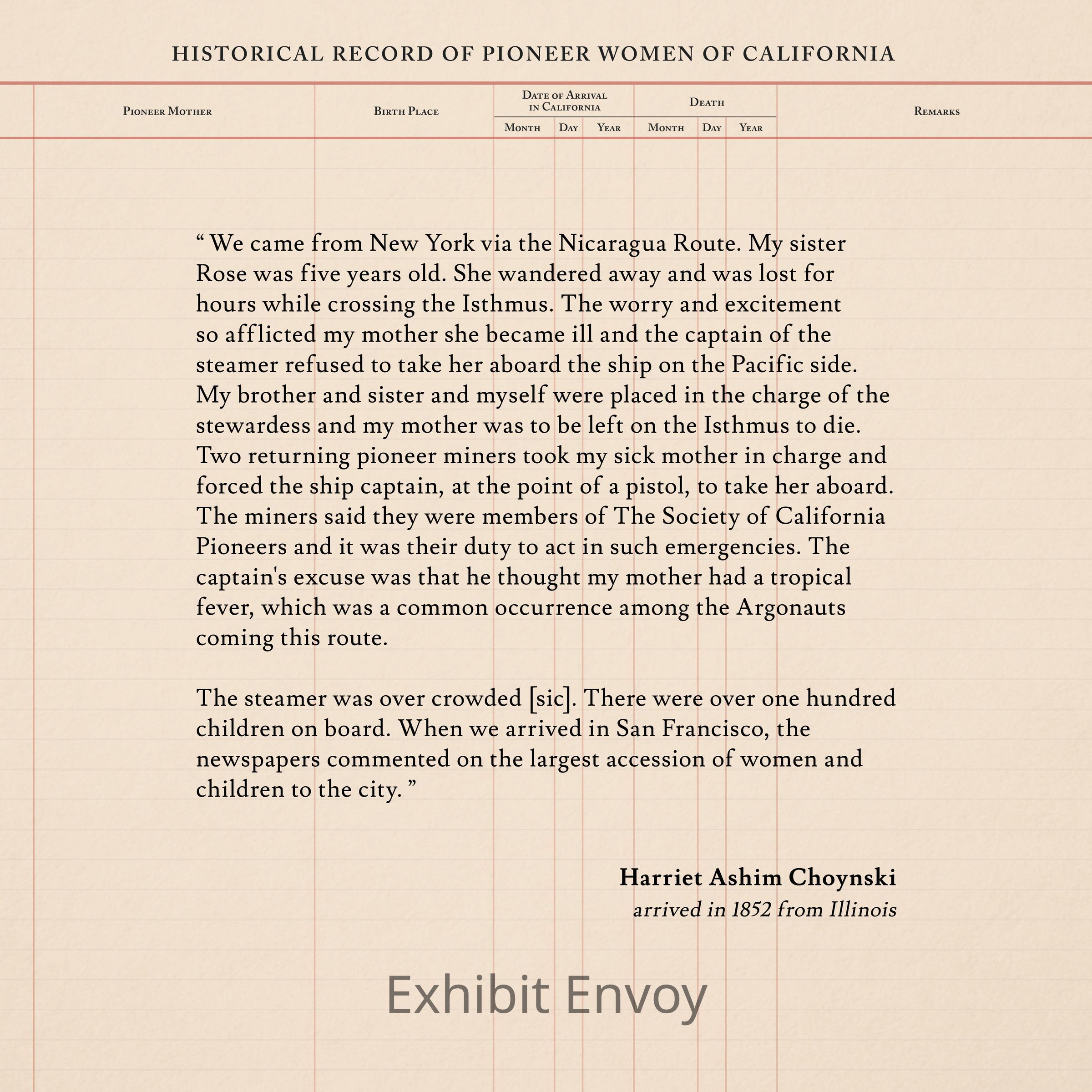 “ We came from New York via the Nicaragua Route. My sister Rose was five years old. She wandered away and was lost for hours while crossing the Isthmus. The worry and excitement so afflicted my mother she became ill and the captain of the steamer refused to take her aboard the ship on the Pacific side. My brother and sister and myself were placed in the charge of the stewardess and my mother was to be left on the Isthmus to die. Two returning pioneer miners took my sick mother in charge and forced the ship captain, at the point of a pistol, to take her aboard. The miners said they were members of The Society of California Pioneers and it was their duty to act in such emergencies. The captain's excuse was that he thought my mother had a tropical fever, which was a common occurrence among the Argonauts coming this route.