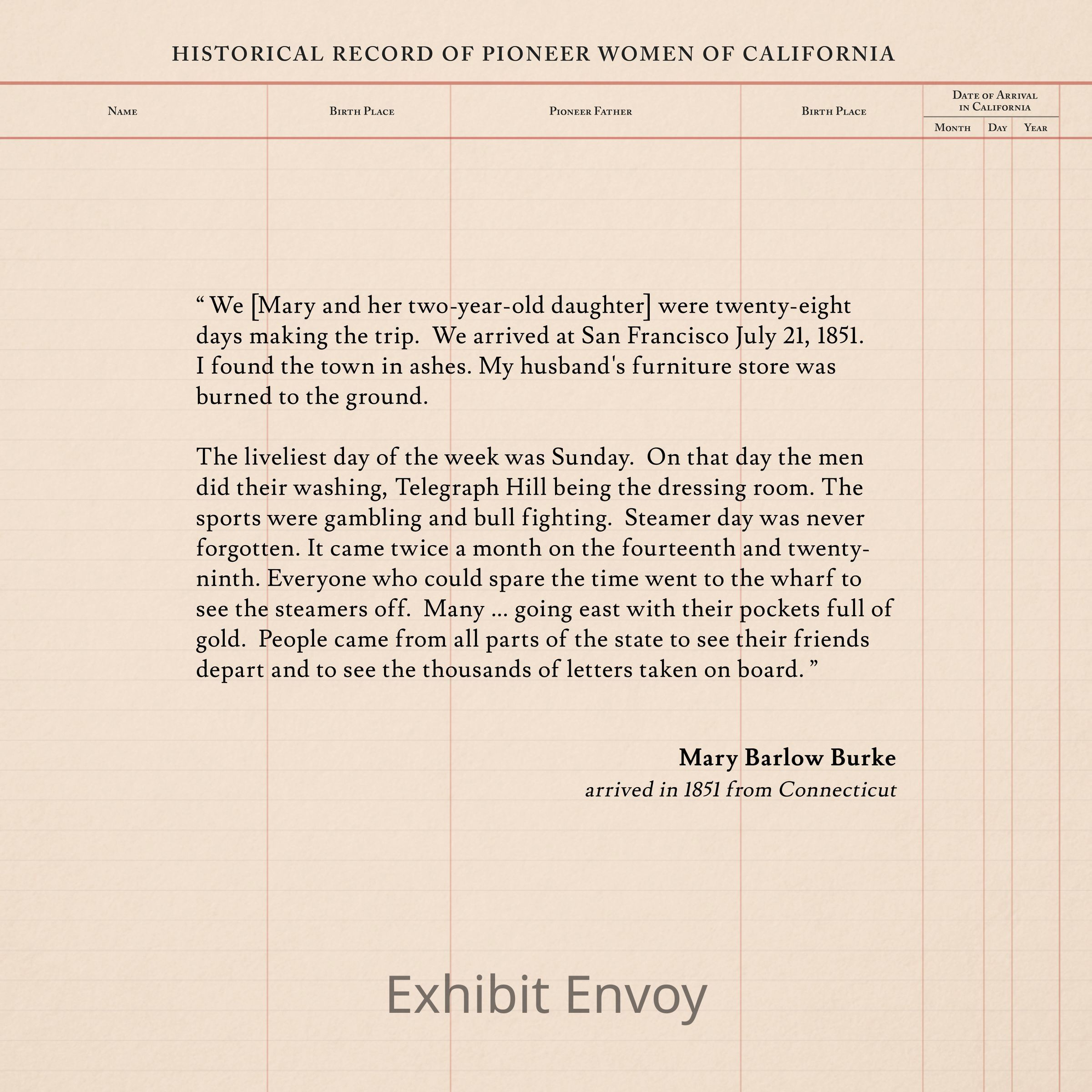 “ We [Mary and her two-year-old daughter] were twenty-eight days making the trip. We arrived at San Francisco July 21, 1851. I found the town in ashes. My husband's furniture store was burned to the ground.