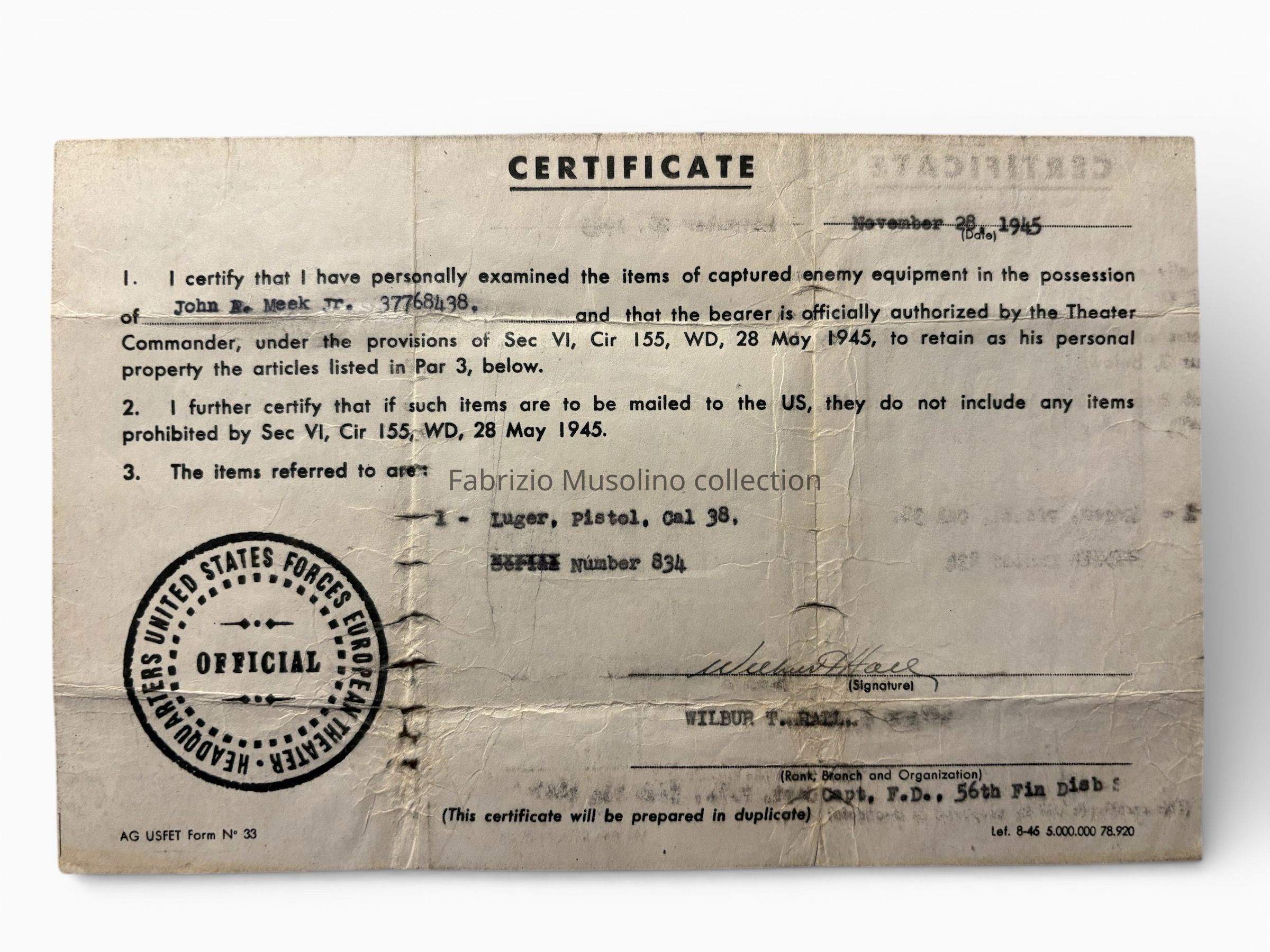 Certificate of capture, Luger pistol