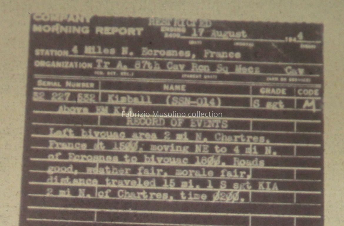 Staff Sergeant Bruce N. Kimball (ASN: 32227532) was killed in action on August 17th, 1944, near Chartres.