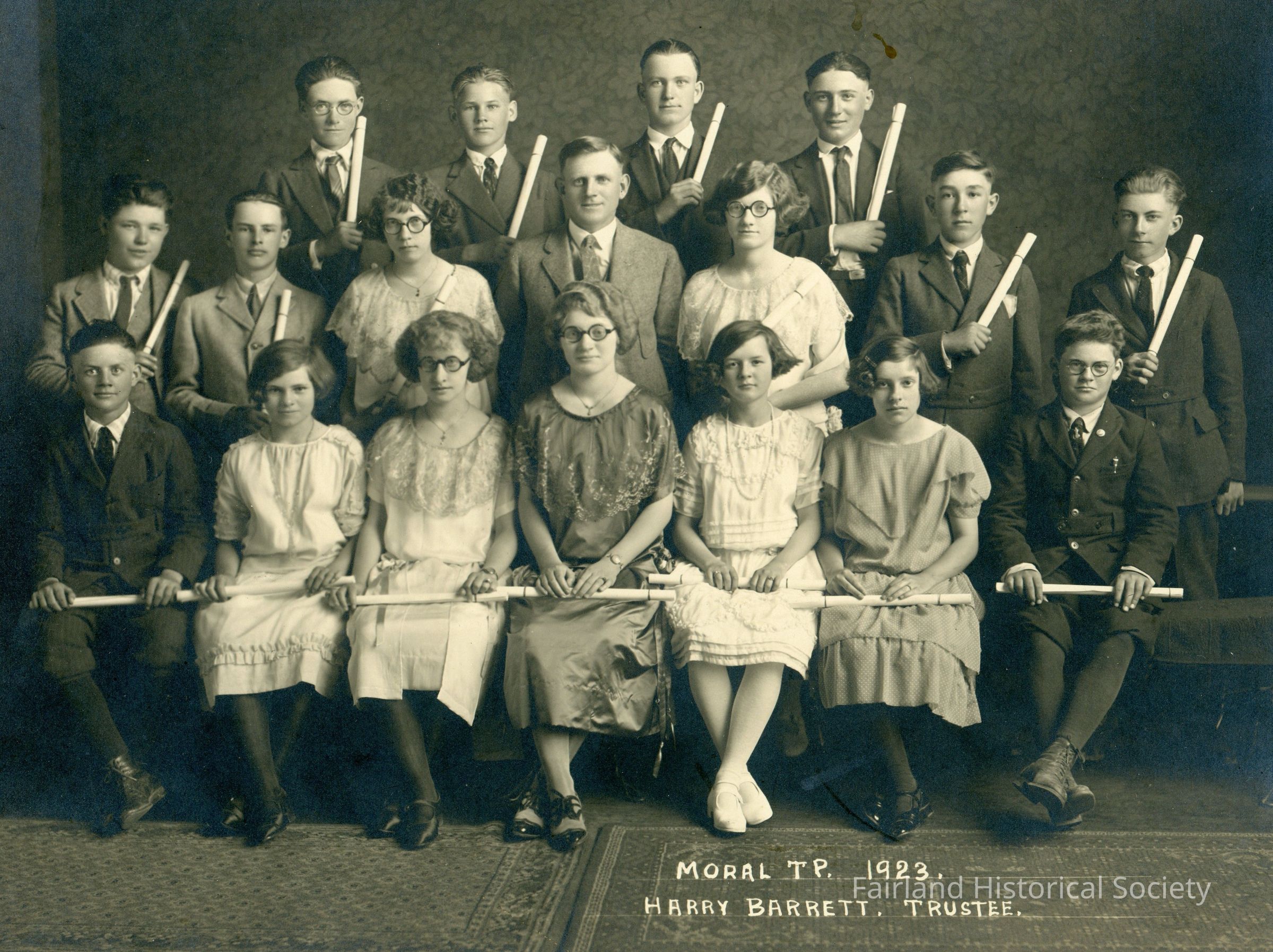 Front: Wallace Barney Mohr, Roberta Bush, Lelia Heck, Dorothy Means, Jeanette Mohr, Cecil McNew, Walter King; Middle: Jim Tierney, Edwin Pritchard, Mildred Wiseman, Harry Barrett (Trustee), Jeanette Barrett, Raymond Yarling, George Kissel; Back: Clancy Williams, Ben Patrick, Ed Crosby, John Hennis (as handwritten on back)Photograph Details
