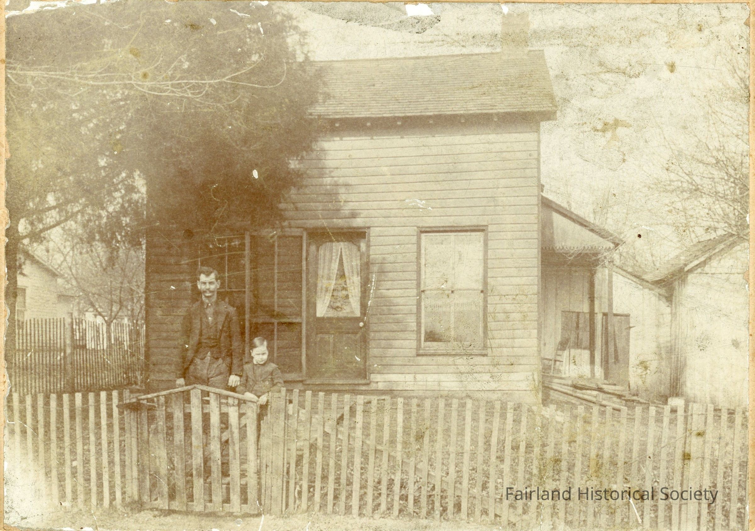 Ed Clark Plymate (1870-1950) & his son, Russell (1894-1954), are standing in front of their home in Fairland, Indiana, about 1898-1899. (This is likely 306 W Washington Street before additions to the house. Ed C. Plymate purchased lot 5 on Washington St (Odell’s 2nd Addition) on 23 Sep 1898 for $200.)