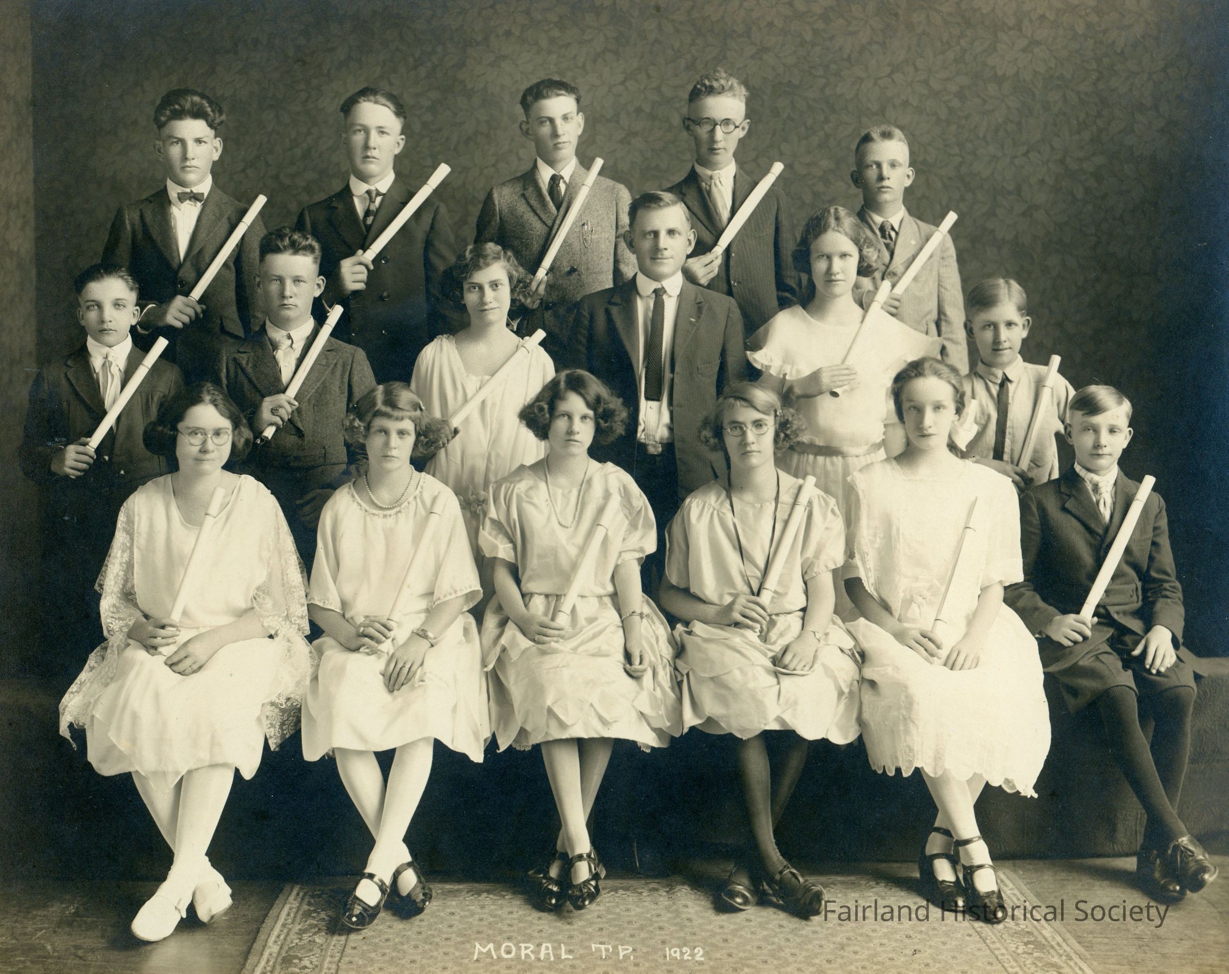 Back: ?, John Hennis, Ralph Yarling, ?, Kenneth Parker; middle: ?, Raymond Yarling, Alberta Andrews, Harry Barrett (Trustee), Delores Andrews, ?; Front: Nina Kroening, Walker, ?, Gladys McDonald, Lelia Mae McCormick (as handwritten on back)Photograph Details