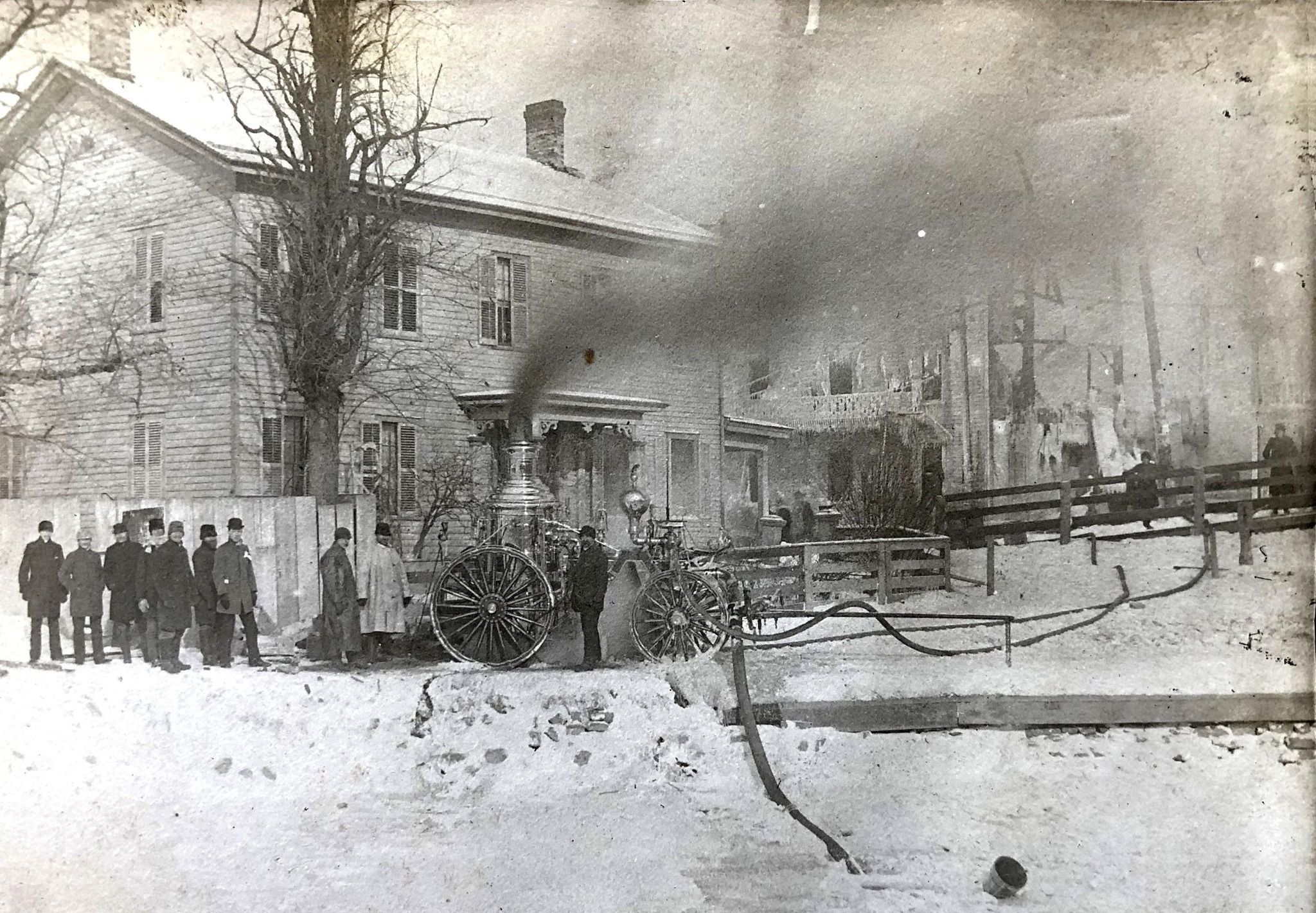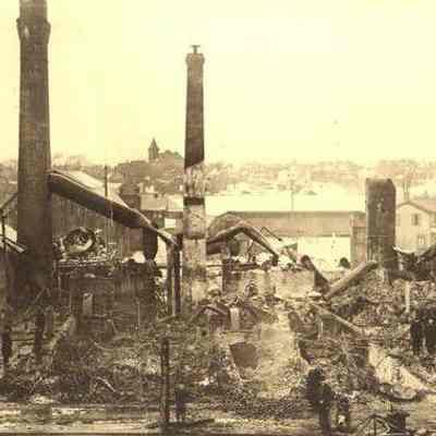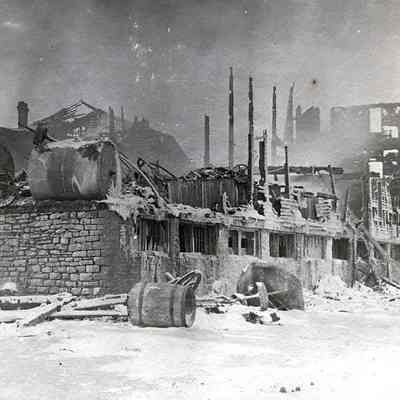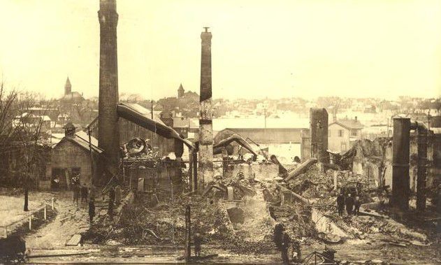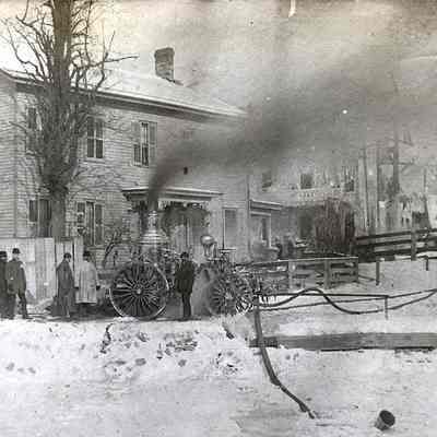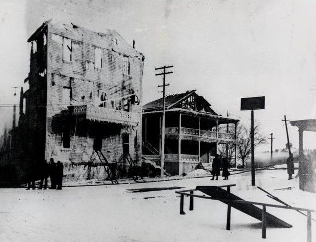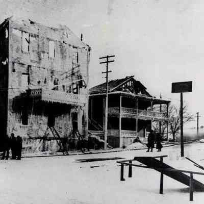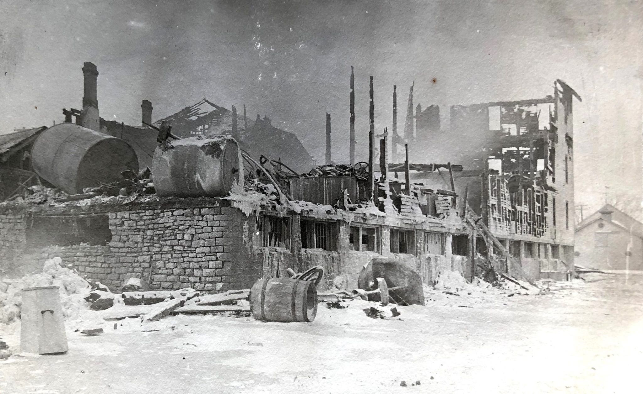 Depicts the aftermath of the fire. Erie Canal in the foreground. Photograph Courtesy of Perinton Town Historian