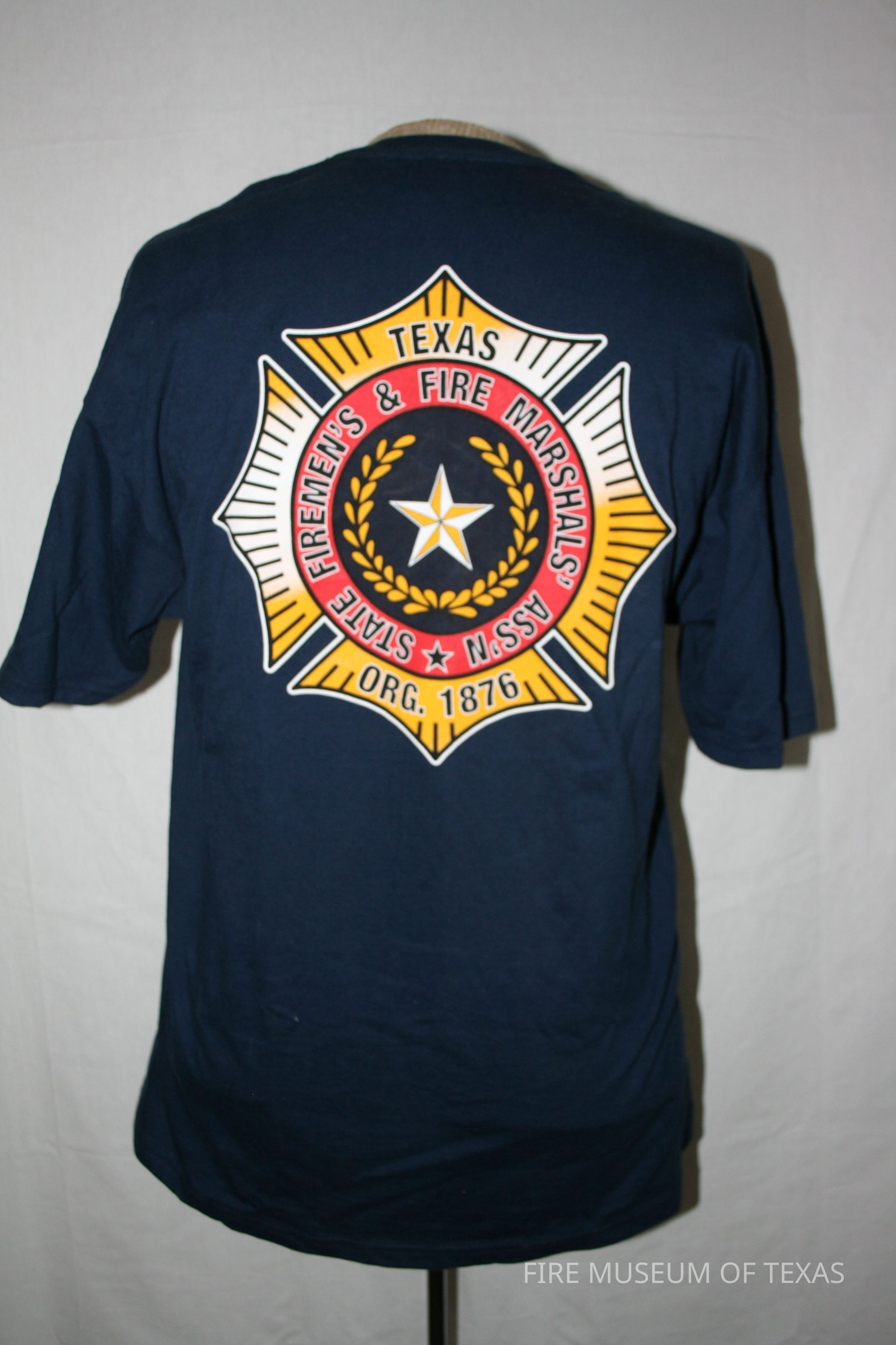 NAVY BLUE T-SHIRT WITH OFFICIAL TEXAS STATE FIREMEN'S AND FIRE MARSHALS ASSOCIATION LOGO.Cataloged By