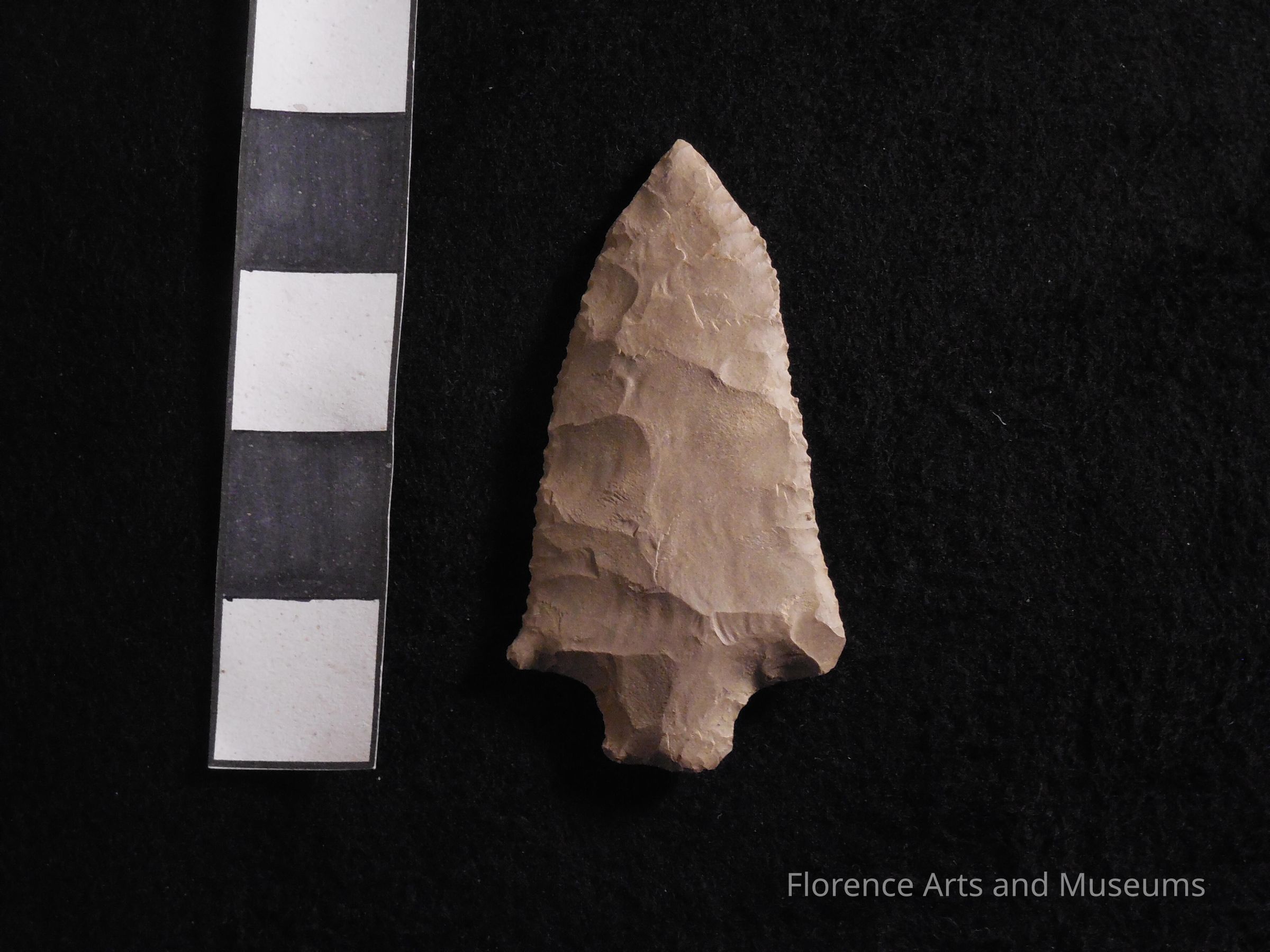 The Pickwick point is a medium to large sized projectile point with flared shoulders and a triangular shape. This example has a finely serrated blade. This point type was named for the Pickwick Basin of northwest Alabama where it was first identified by David DeJarnette in 1962.Context