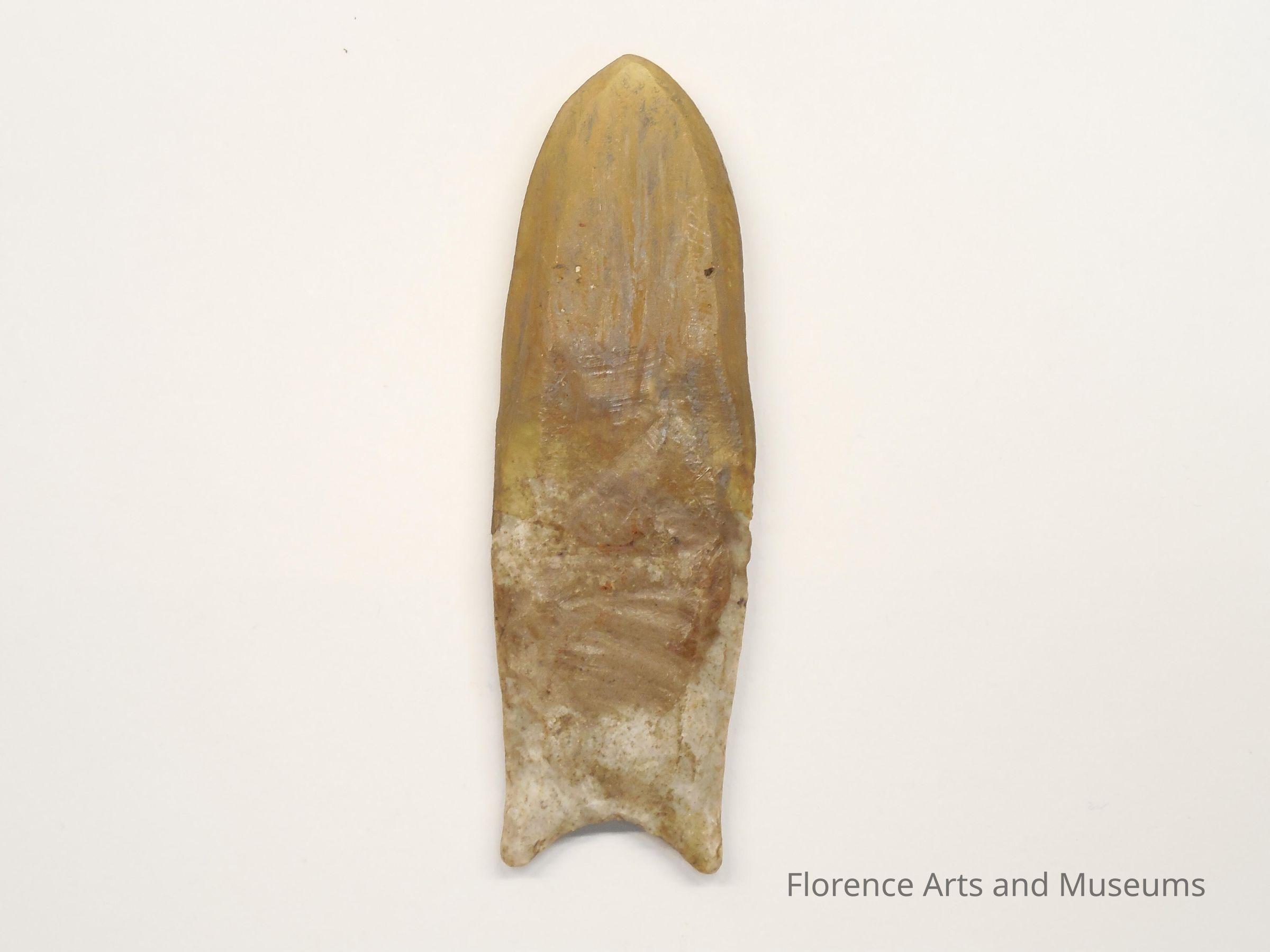 The Clovis point type is typically triangular and fluted with a concave base. The flute typically runs from the base on one or both sides and can cover up to 1/3 of the size of the point. The Clovis is made through percussion flaking with pressure flaking to finish the blade. The Clovis point was first identified near Clovis New Mexico in 1935 and long thought to be the first lithic technology in North America. This point has been reconstructed.Context