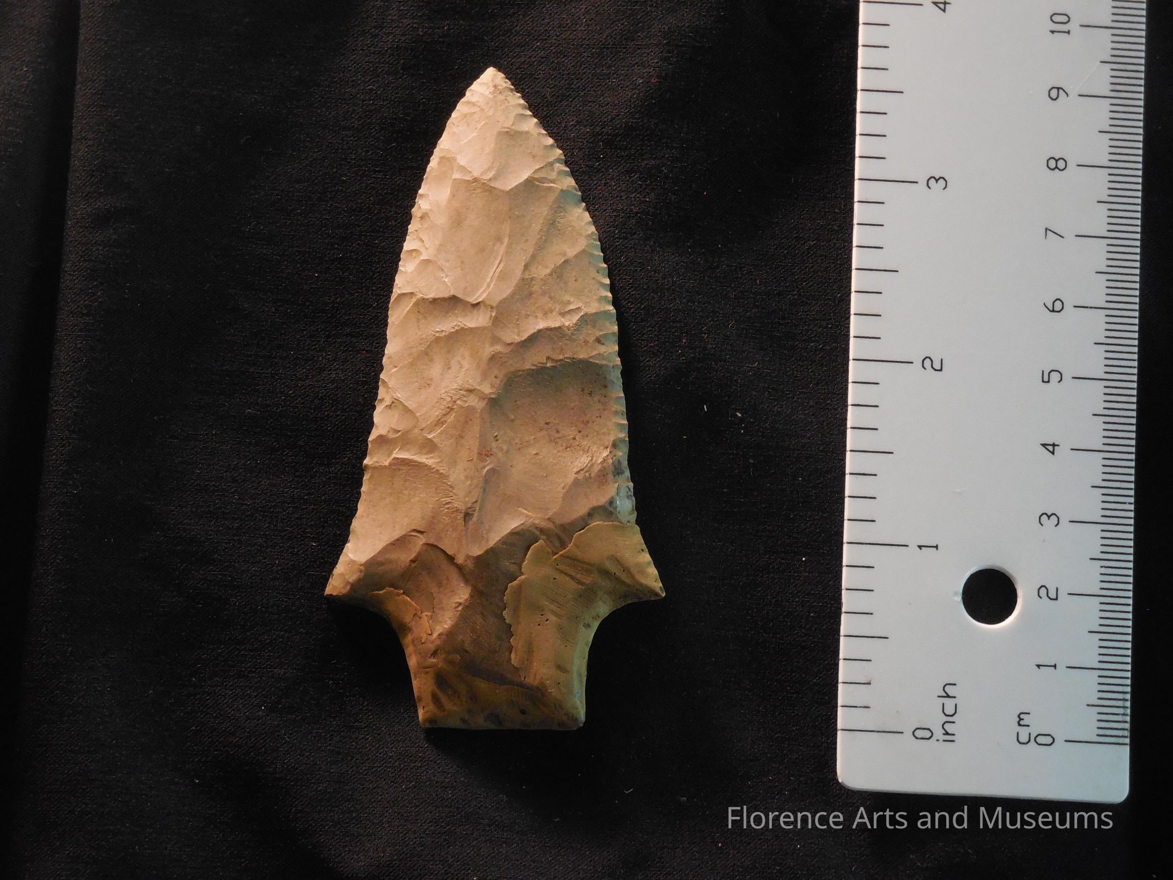 The Pickwick point is a medium to large sized projectile point with flared shoulders and a triangular shape. This example has a finely serrated blade. This point type was named for the Pickwick Basin of northwest Alabama where it was first identified by David DeJarnette in 1962.Context