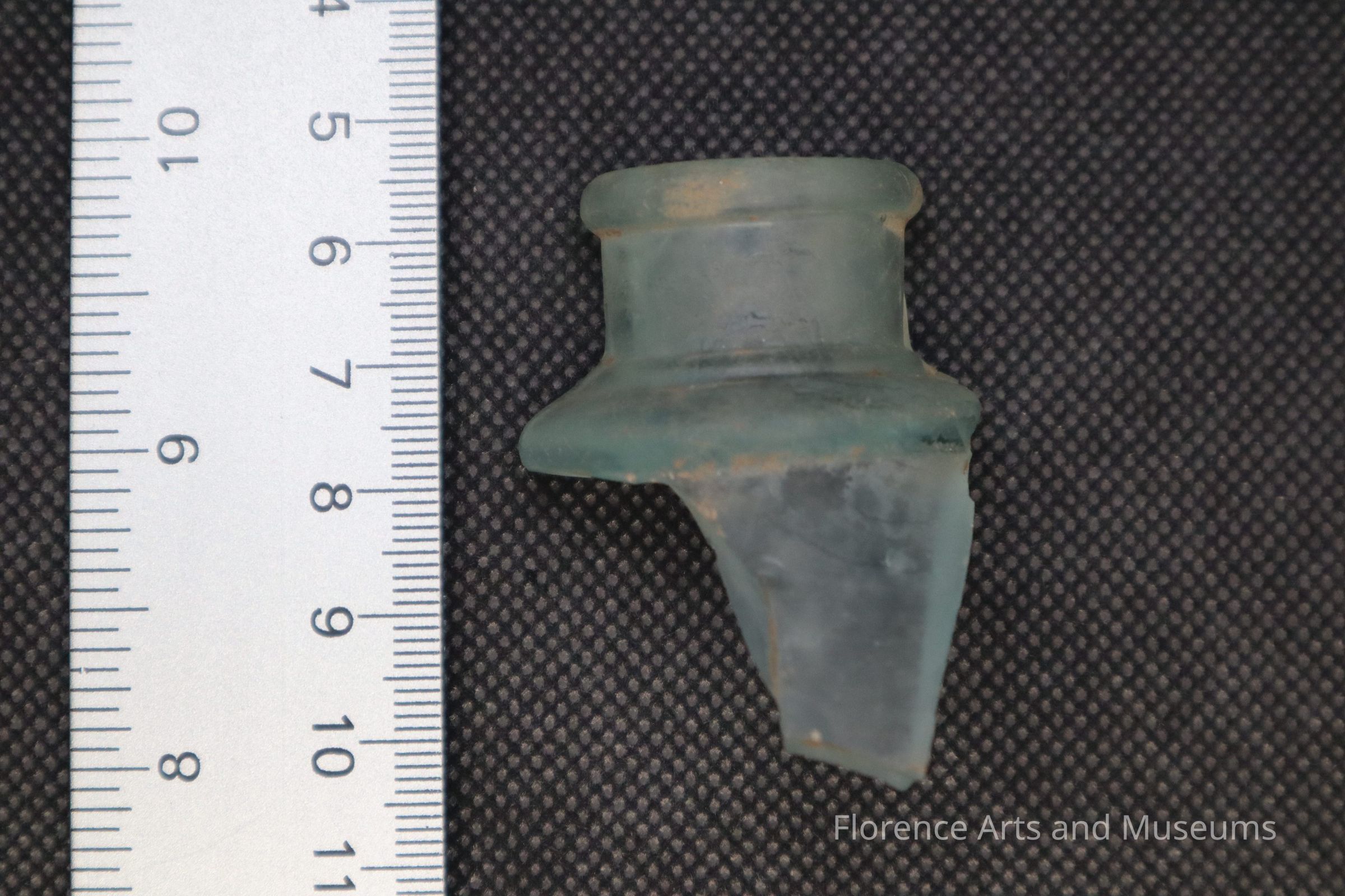 An aqua container glass fragment, specifically a bottle lip and neck.