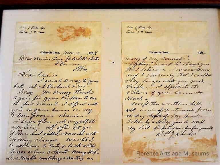 This is a letter of thanks written by Robert J. Rhodes to the Lambeth family in 1908. Rhodes was returning to his home in Whiteville, TN and stopped into the home of the Lambeths. He had spent time in the house in 1863 as a soldier with Company E of the 3rd Tennessee Cavalry (C.S.A.)