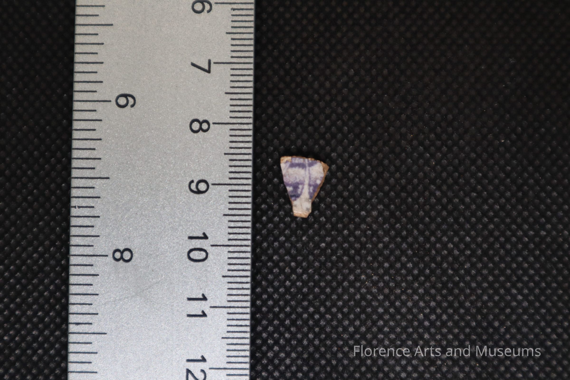 Whiteware sherd with a purple print.