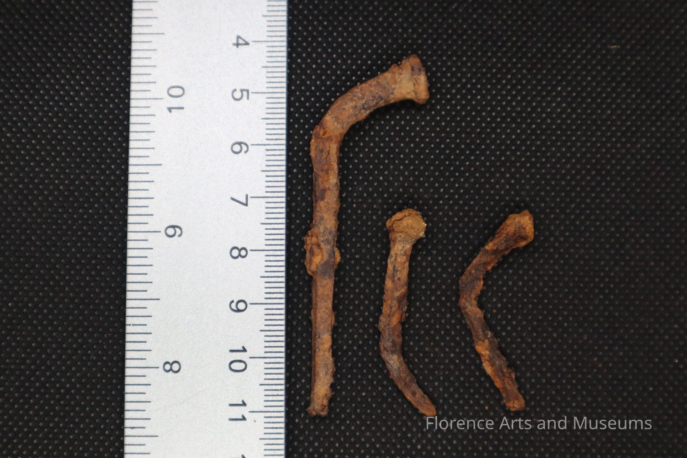 These three nails were excavated at Test Unit 3, Level 3 on May 21st, 2023, at Pope's Tavern.Made/Created