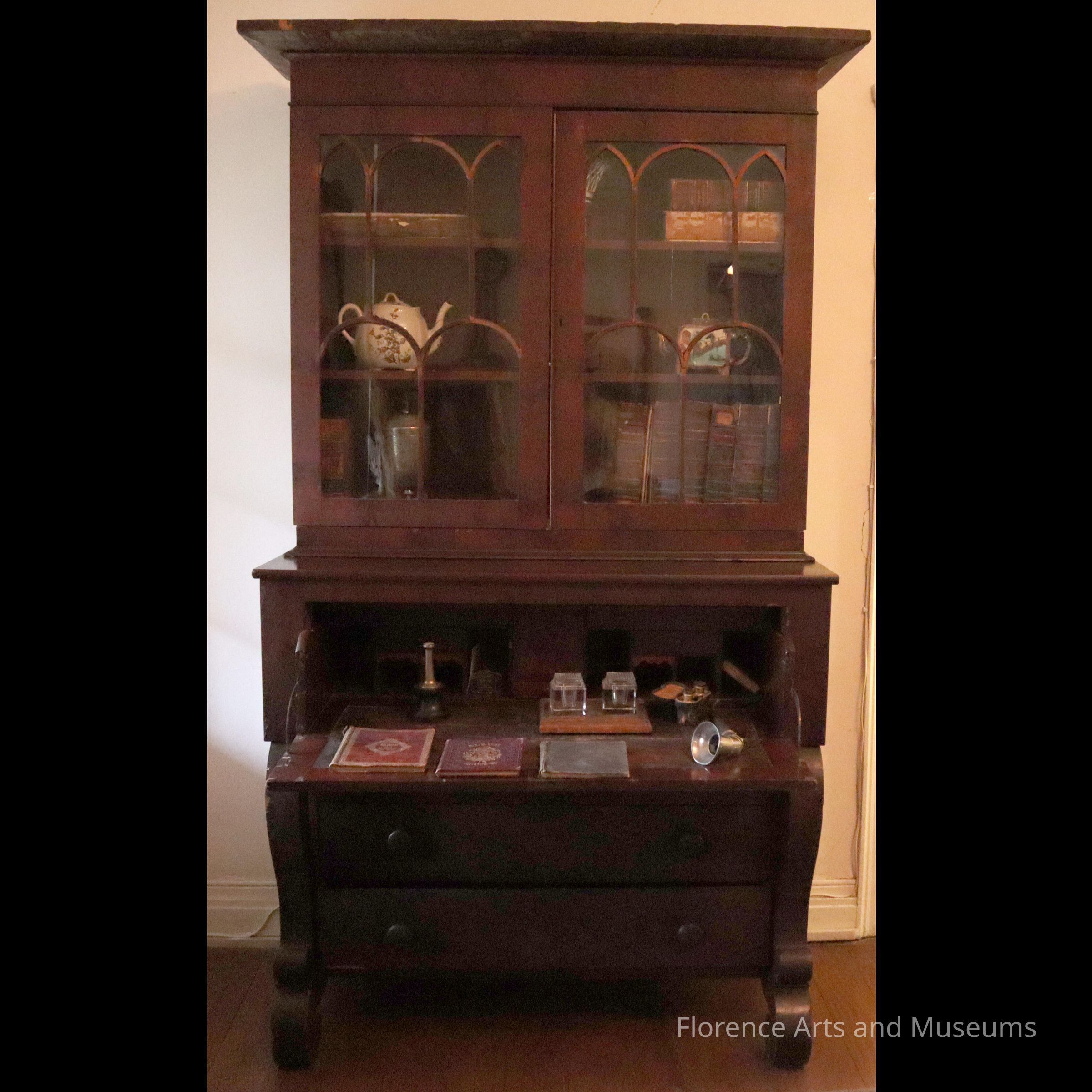 Wooden secretary/book shelf with two glass doors and three shelves; a drop leaf desk and several compartmentsContext