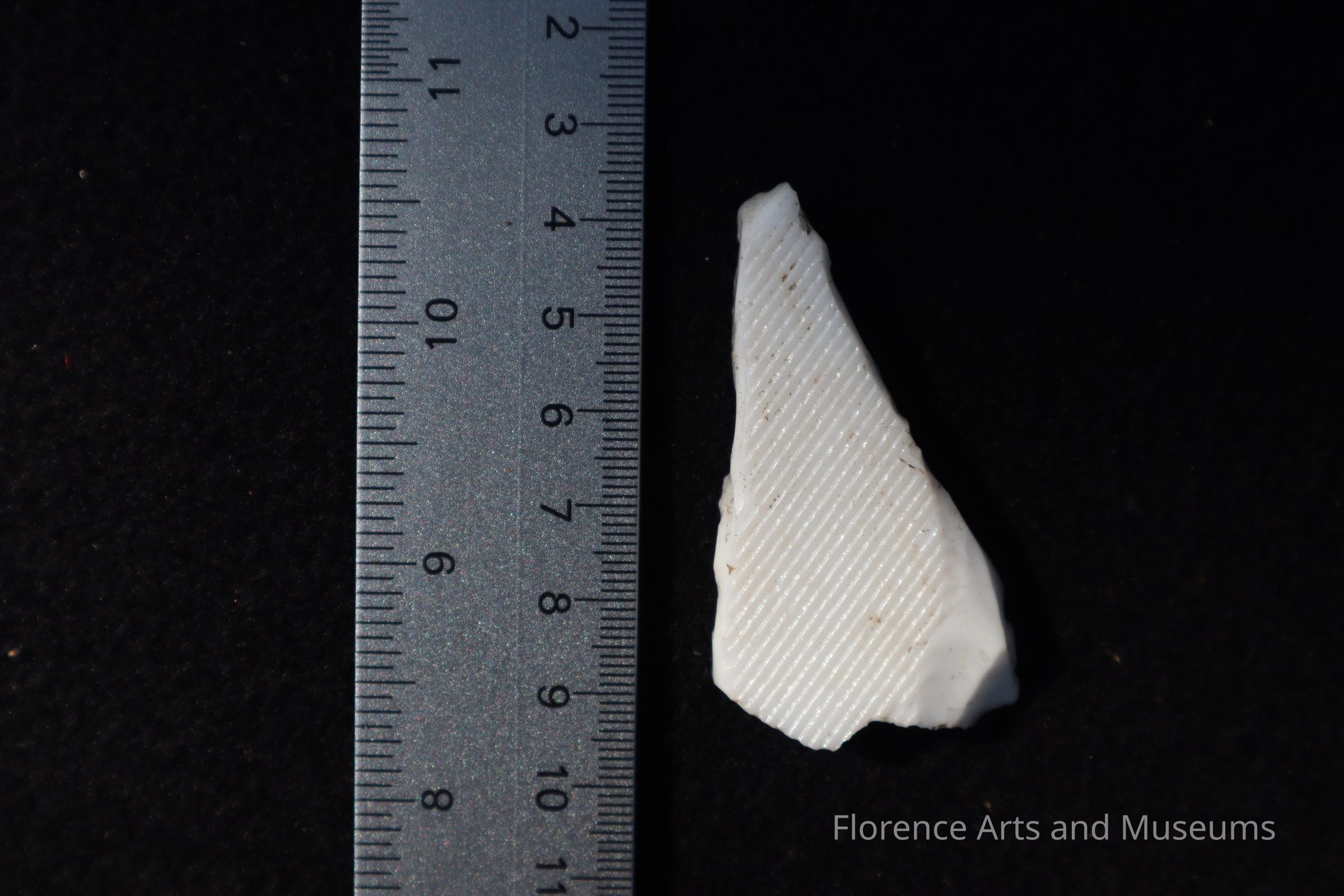 Unknown white ceramic sherd with parallel lines along one face