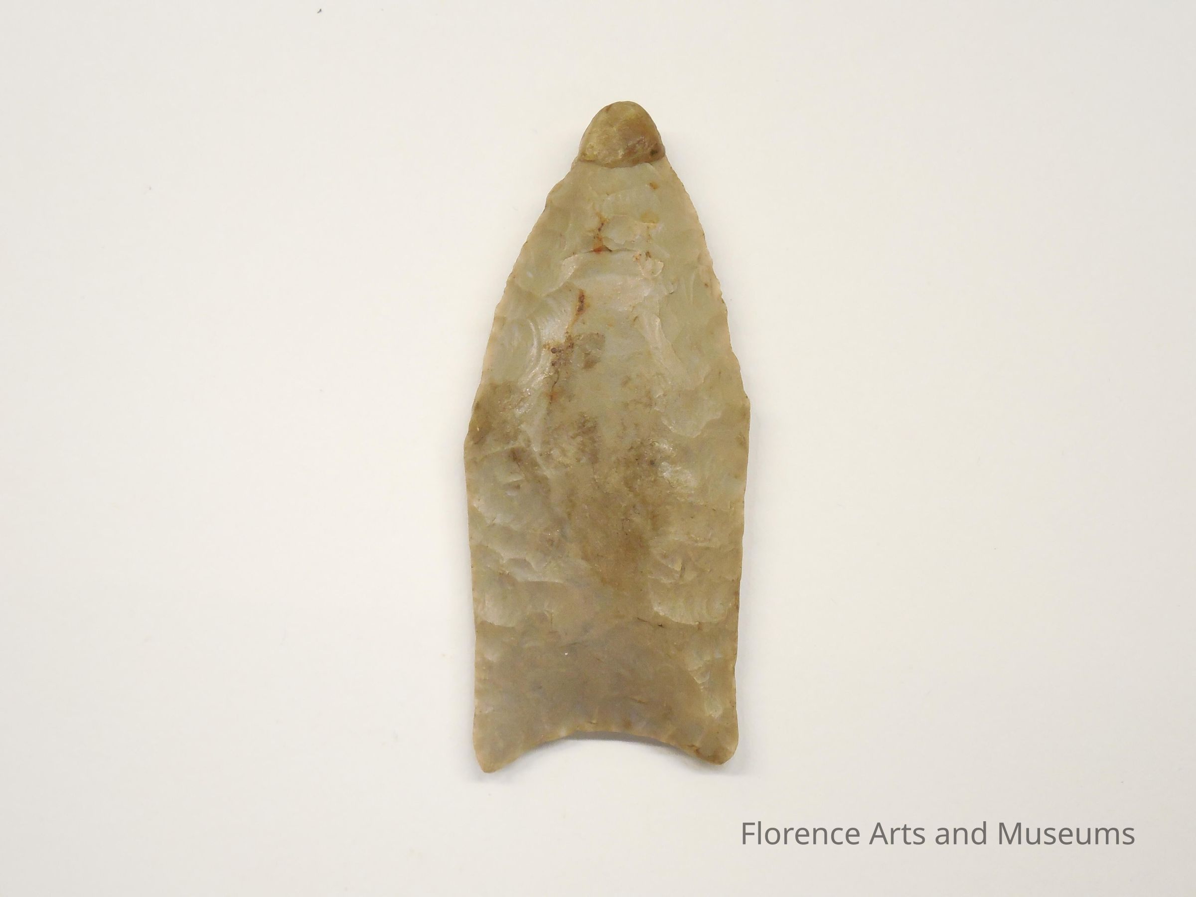 The Clovis point type is typically triangular and fluted with a concave base. The flute typically runs from the base on one or both sides and can cover up to 1/3 of the size of the point. The Clovis is made through percussion flaking with pressure flaking to finish the blade. The Clovis point was first identified near Clovis New Mexico in 1935 and long thought to be the first lithic technology in North America.Context