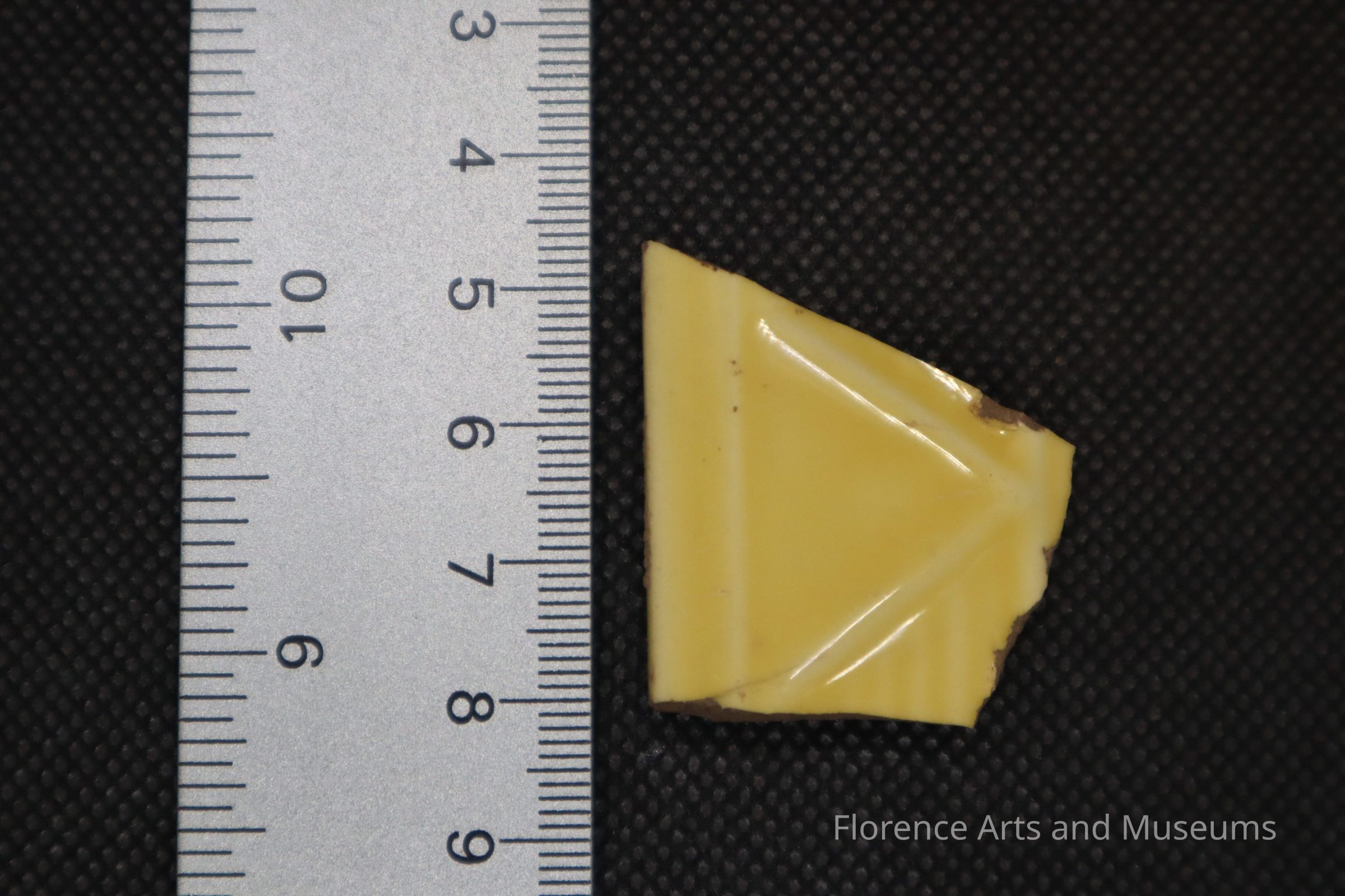 Yellowware fragment with a raised triangle.Entry/Object ID