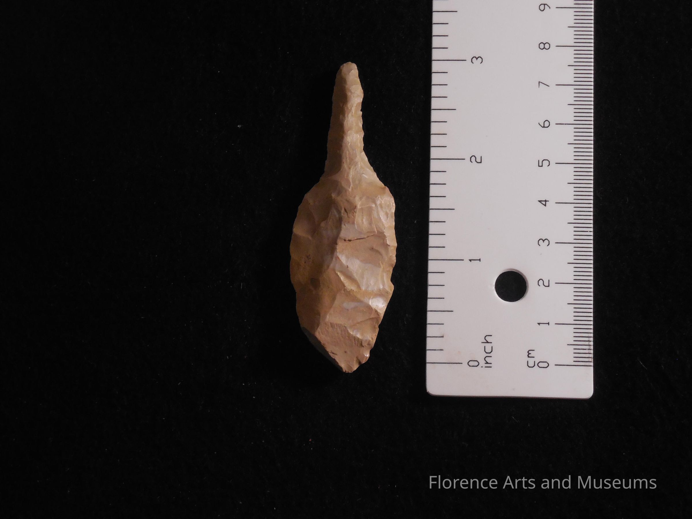 Lithic Tool with rounded hafting area, beveled sides, and sharpened tip.