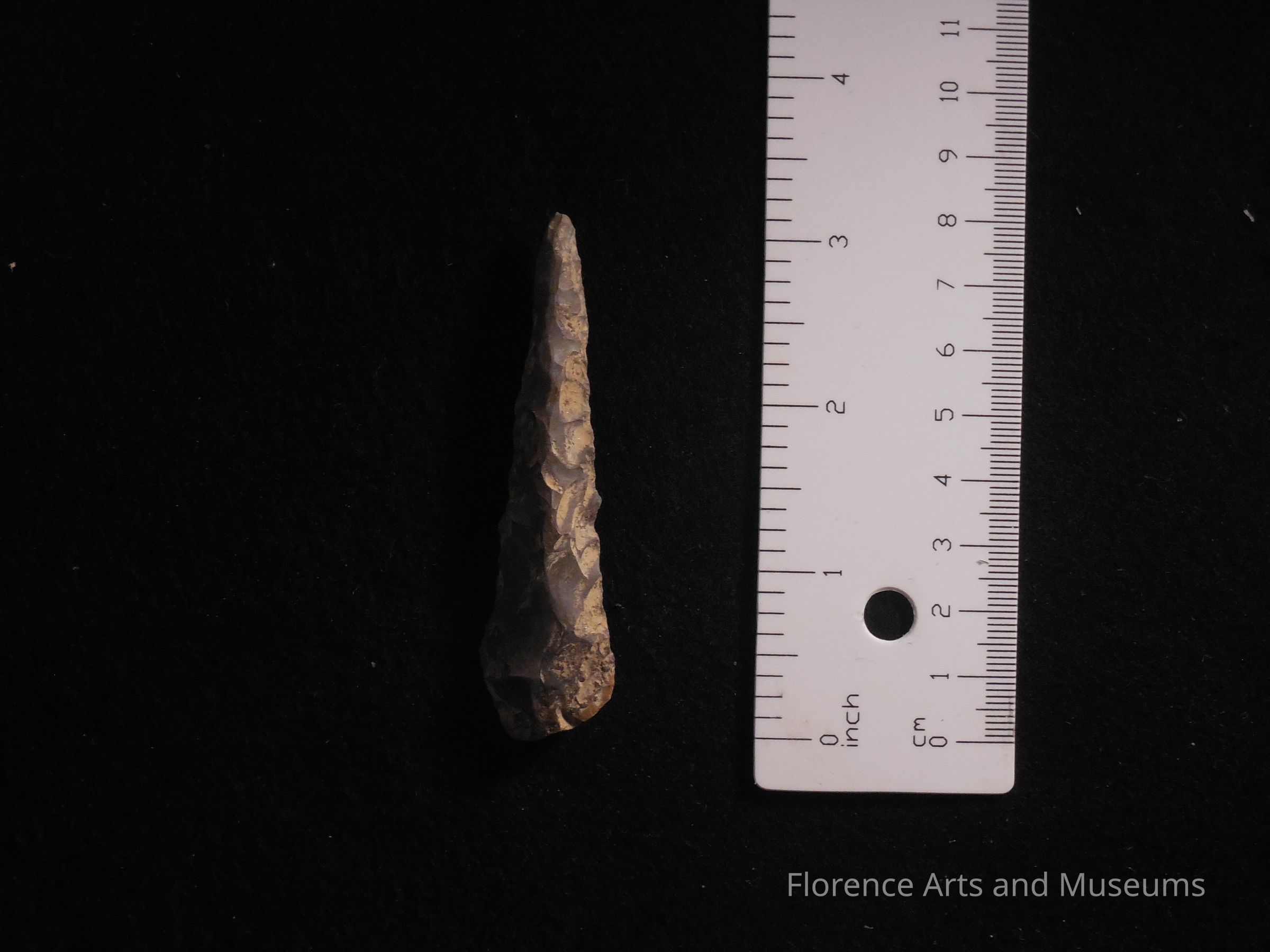 Lithic Tool with rounded hafting area, beveled sides and sharpened tip.