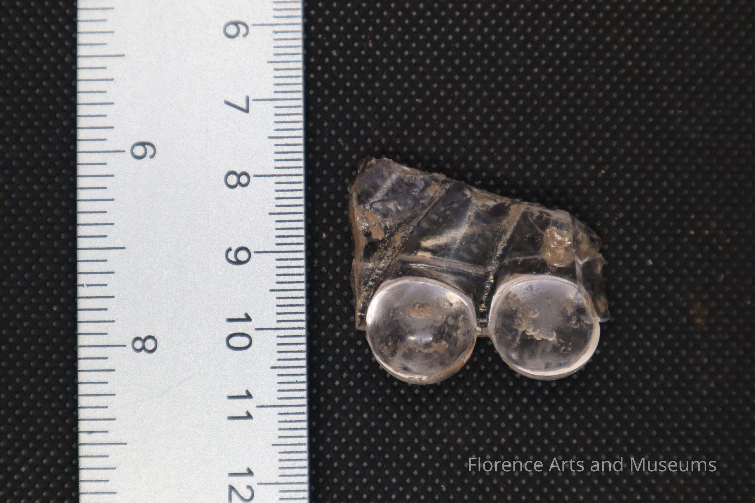A round decorative clear glass fragment, with two button-like glass attached.Context