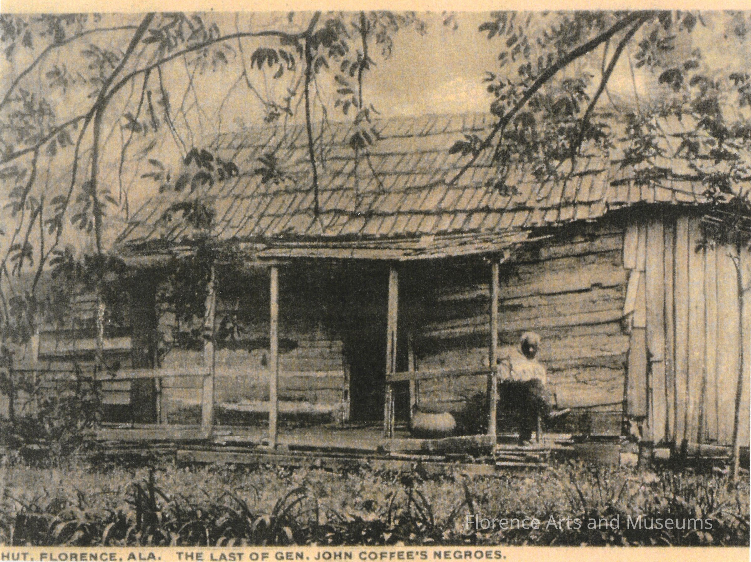 A photograph of a cabin with the last of John Coffee's slaves.Context