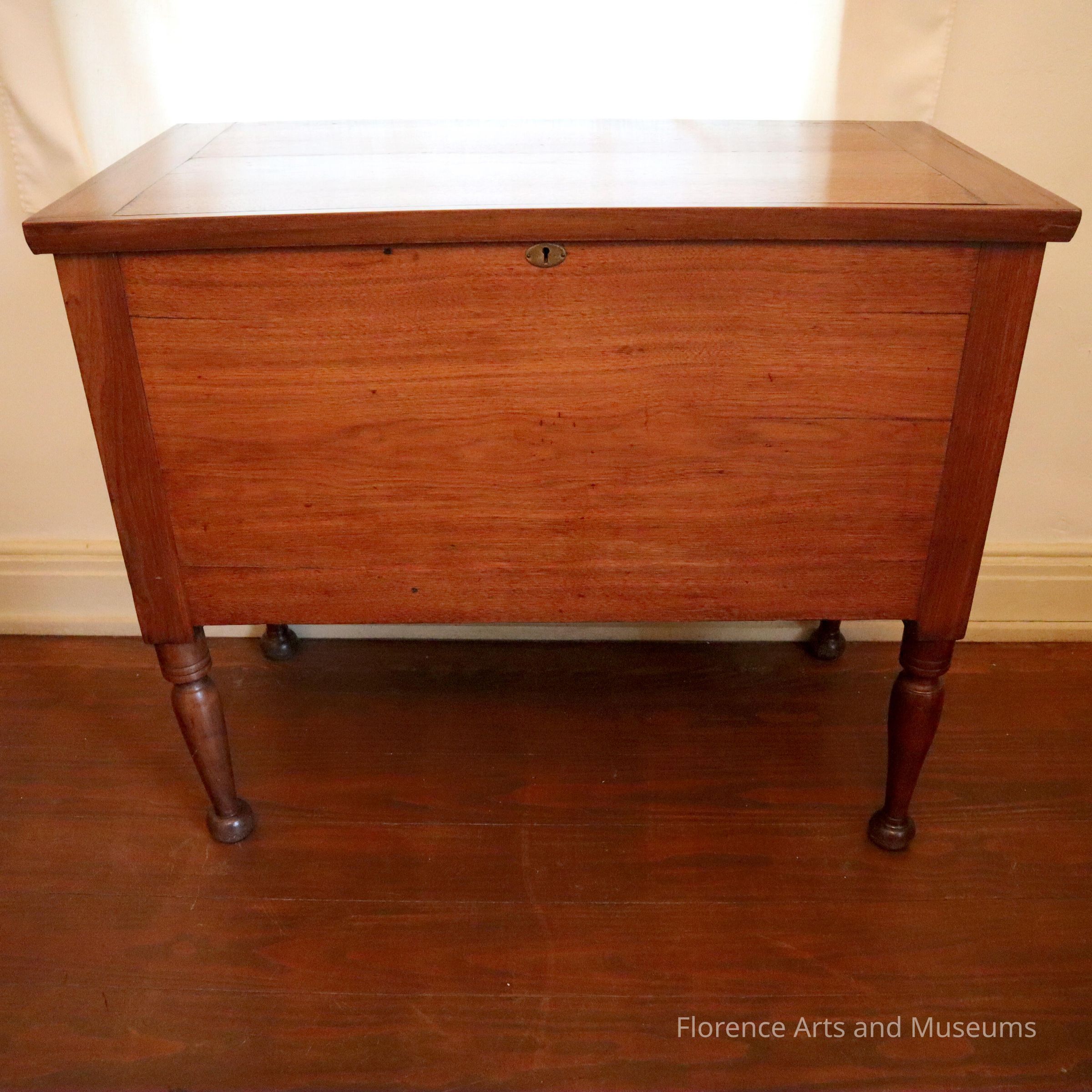 The sugar chest was a sign of wealth in late 18th and 19th century America. The inside is divided into two sections, one for light and another for dark sugar. The locking mechanism is an indication of how valuable sugar was in early America. This particular chest is made of cherry and has turned legs, a sign that it was made in the early 1800s.Materials