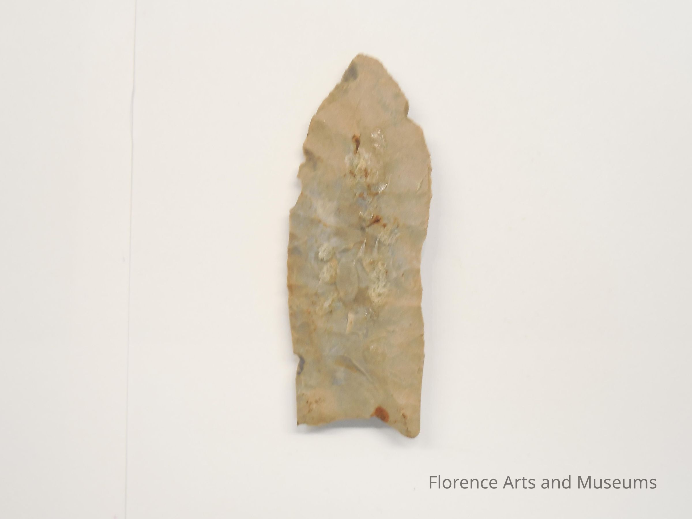 The Clovis point type is typically triangular and fluted with a concave base. The flute typically runs from the base on one or both sides and can cover up to 1/3 of the size of the point. The Clovis is made through percussion flaking with pressure flaking to finish the blade. The Clovis point was first identified near Clovis New Mexico in 1935 and long thought to be the first lithic technology in North America.Context
