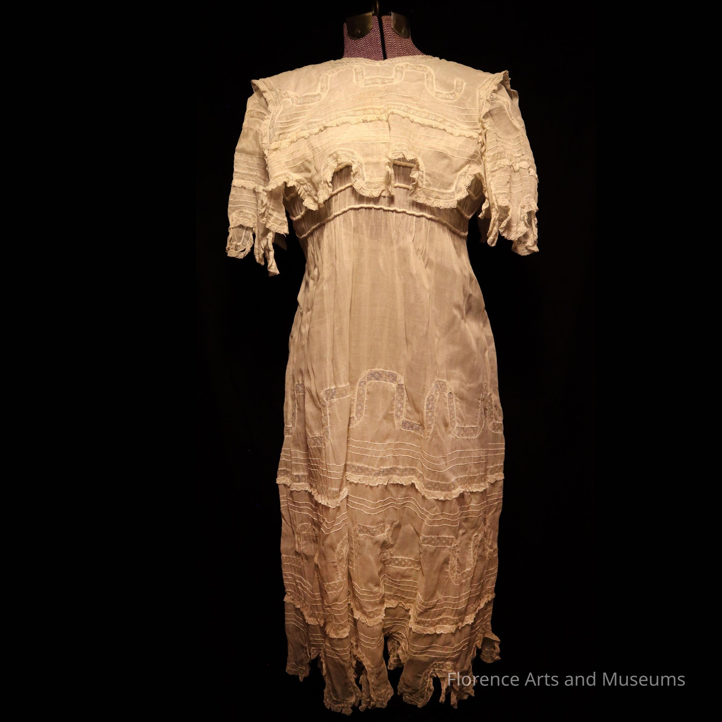Woman's white cotton dress with large bibbed collar, trimmed with lace.