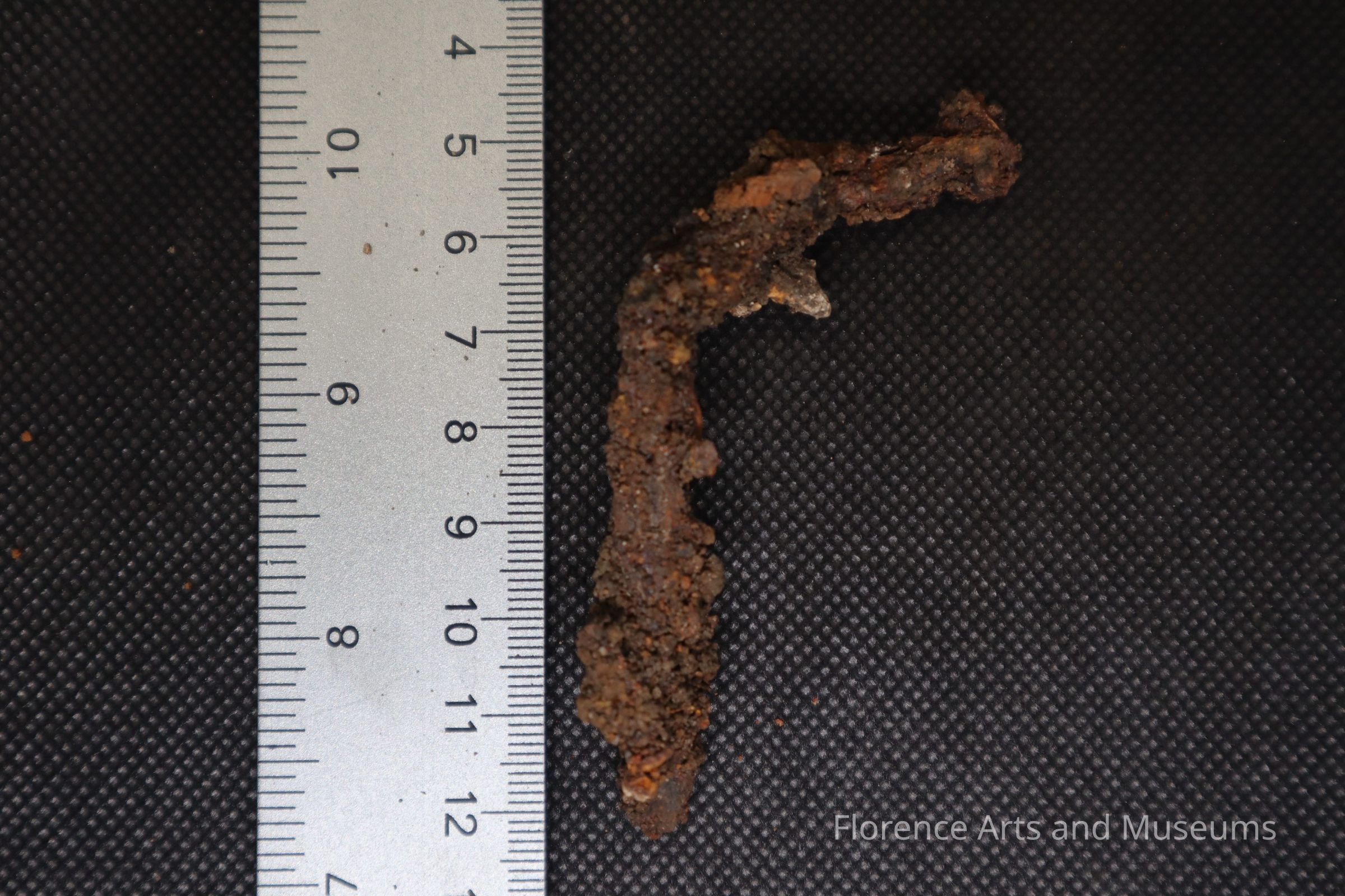 This metal spike was excavated from the cistern on February 25th, 2024, at Pope's Tavern.
