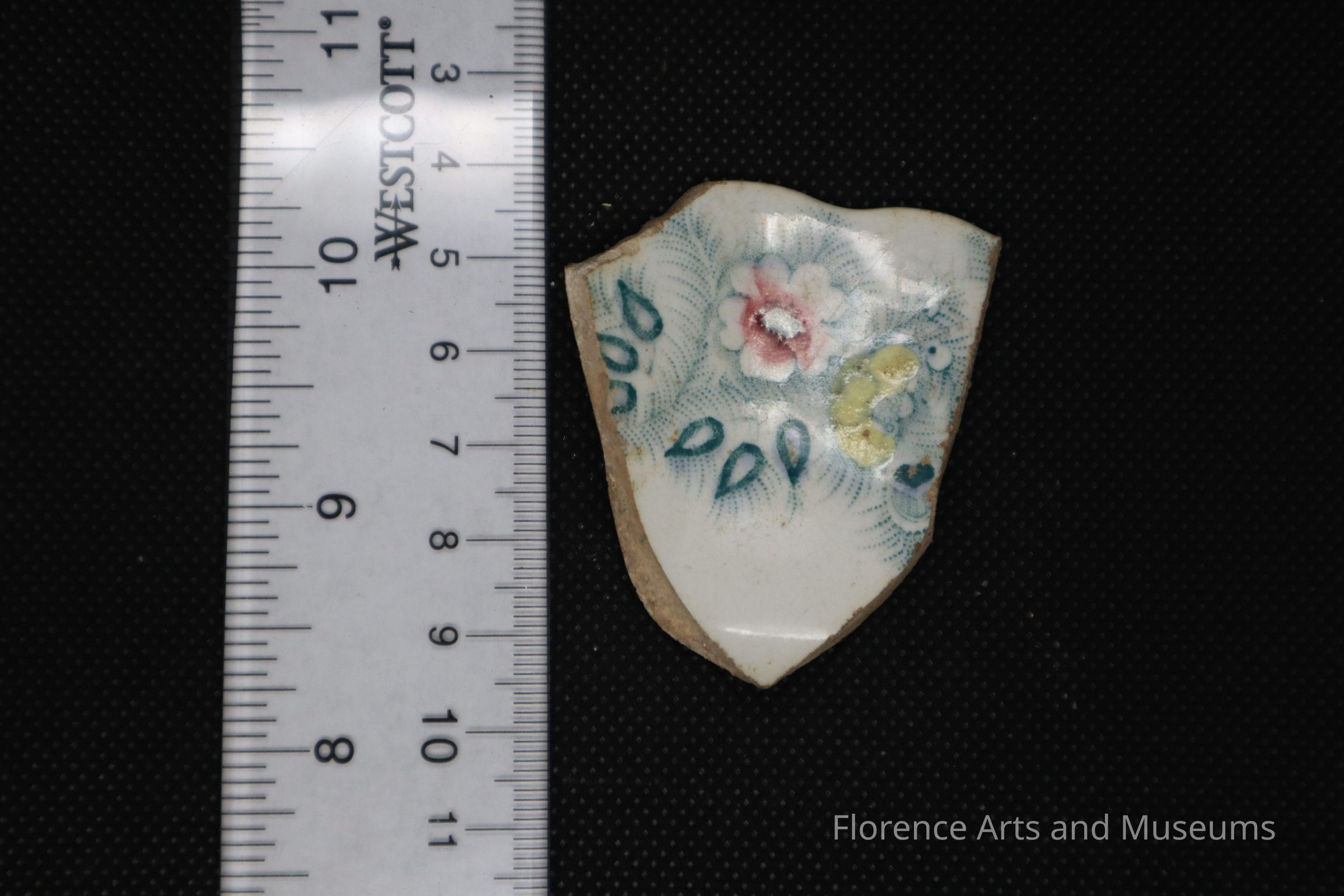 A white, multi-colored dishware fragment with a flower and feather design.Context