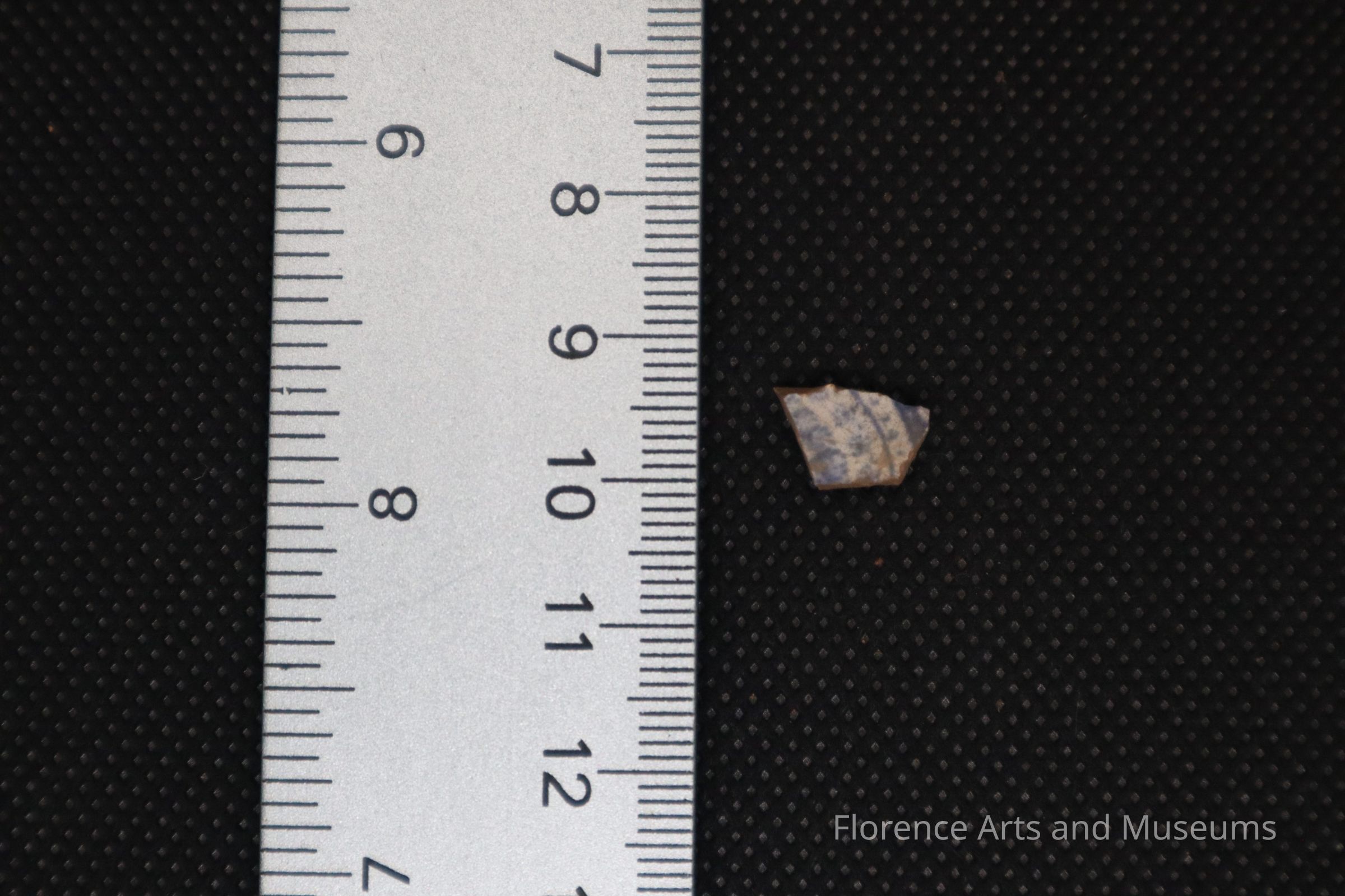 Thin small, faded blue printed whiteware sherd.