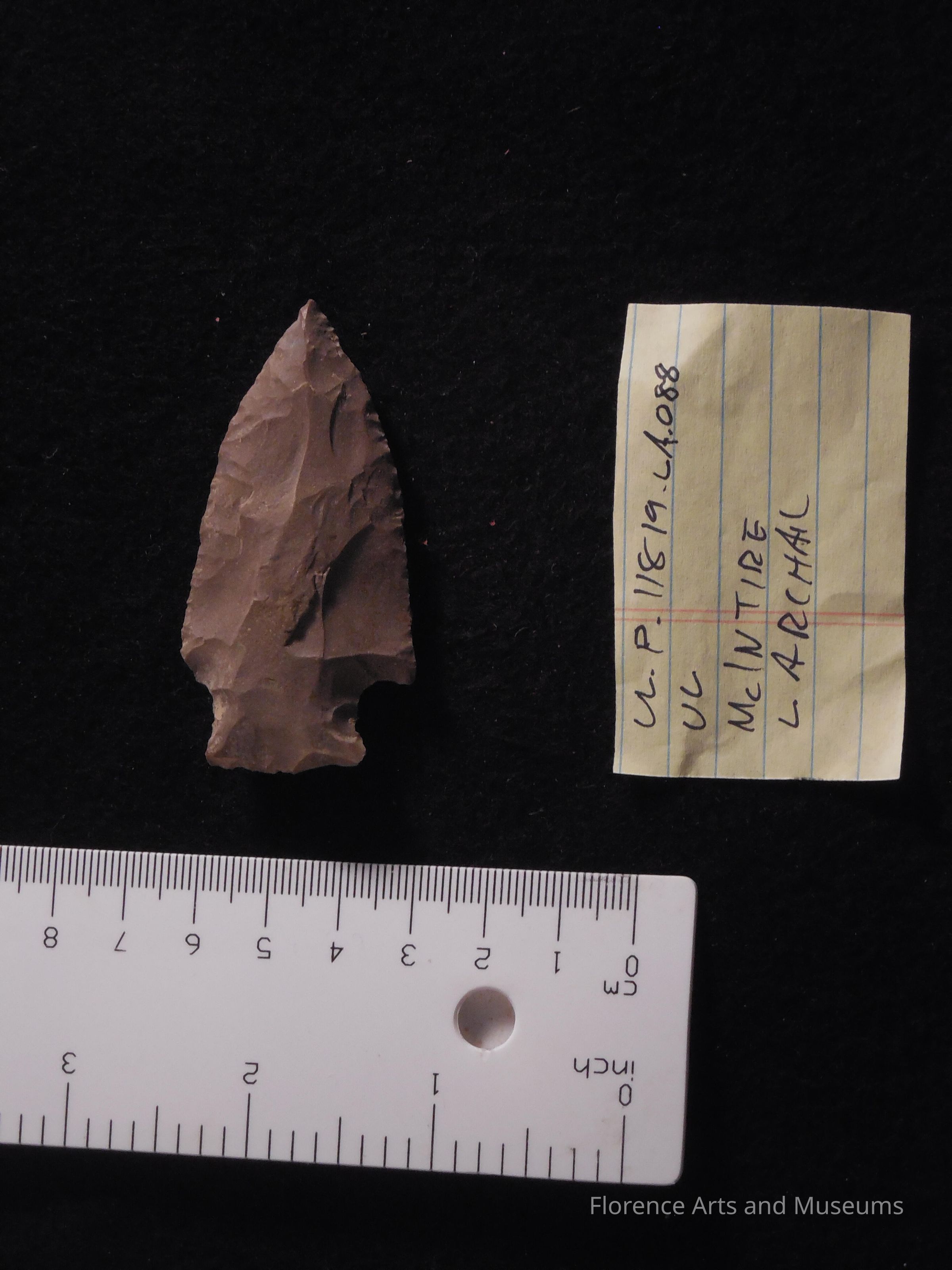 The McIntire point is triangular in shape with an expanding stem and a typically straight base. The shoulders may angle upward or be slightly barbed. Often, it has a asymmetrical shape. This point is named for McIntire Ditch in Limestone County, AL.Context